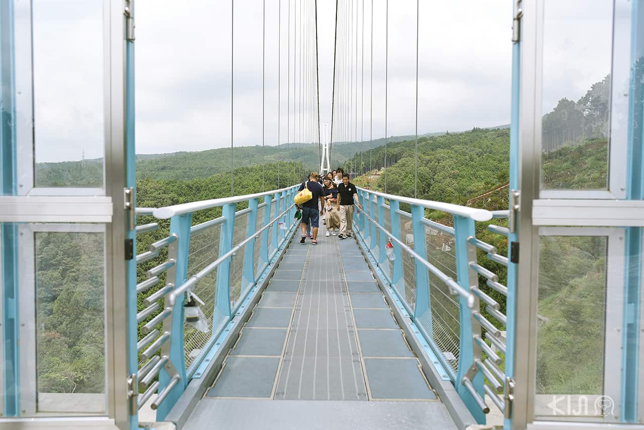 ขณะที่เดินเล่นเพลินๆ บนสะพาน อยากให้ลองสังเกตพื้นตรงกลางทางเดินจะทำเป็นตะแกรงเหล็กเพื่อลดแรงลม ไม่ให้เราเสียวท้องจนเกินไป ความน่ารักอีกอย่างที่ถูกใจถูกใจเรามากคือความใส่ใจในรายละเอียด เพราะมิชิมะสกายวอล์ค ถูกออกแบบให้กว้างกว่าสะพานปกติ เพื่อให้ผู้ใช้รถเข็นก็สามารถมาชมวิว 360 องศา อีกทั้งยังสวนทางกันได้ไม่ต้องกังวลว่าจะขวางทางผู้อื่น
