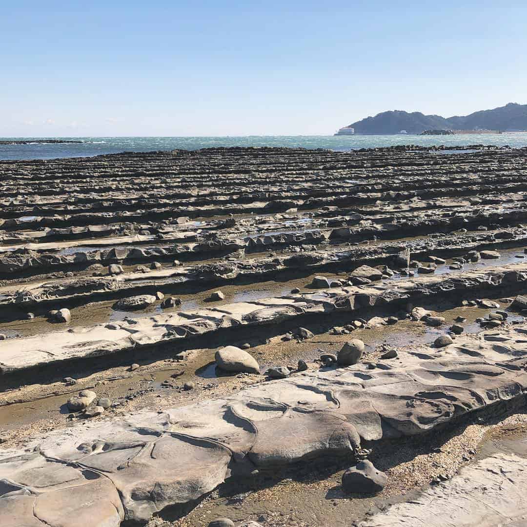 ชายหาดที่มีการเรียงตัวกันของโขดหินเป็นชั้นคลื่นและรูปร่างแปลกตาความยาวกว่า 8 กิโลเมตร รอบๆ ตัวเกาะอาโอชิมะ