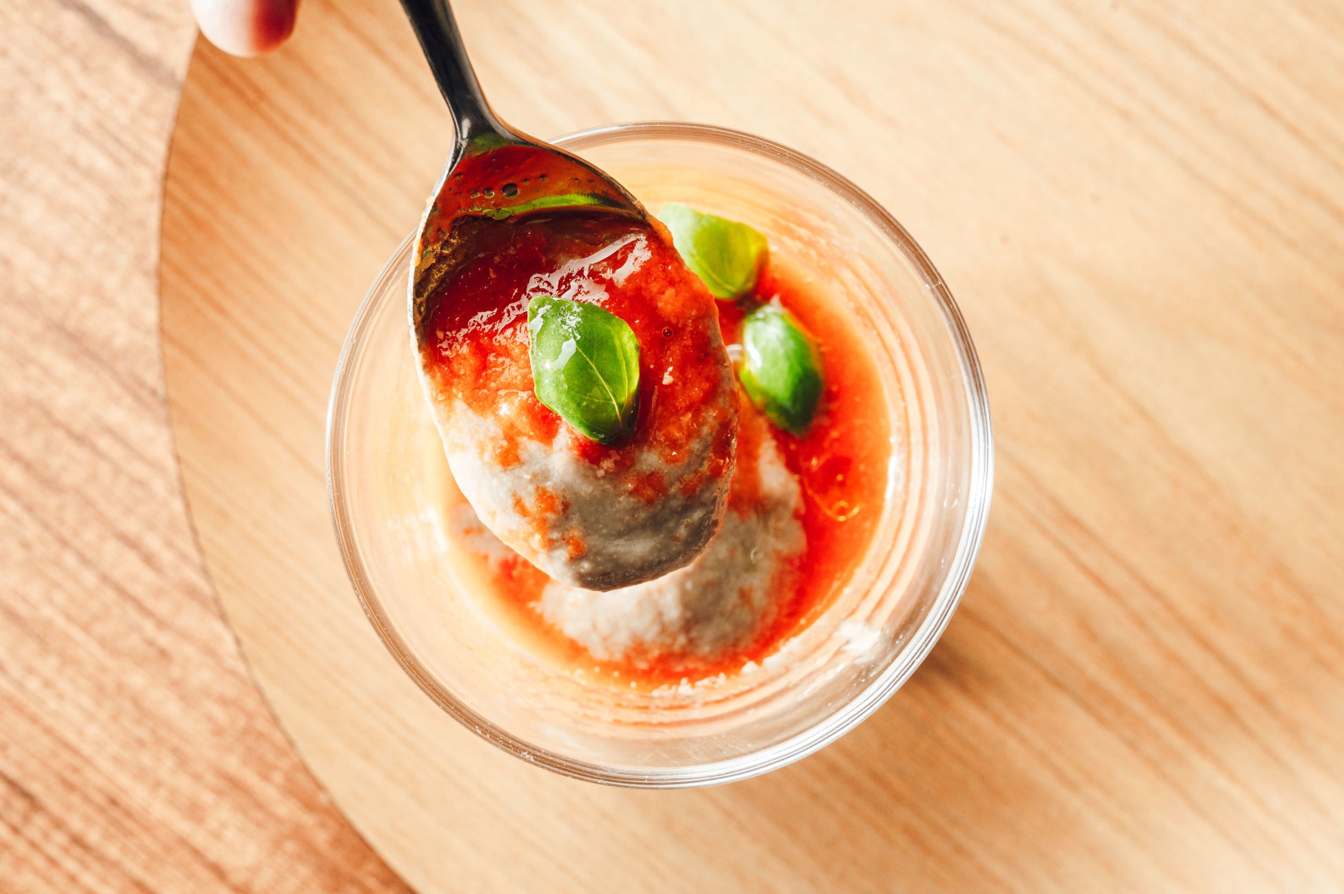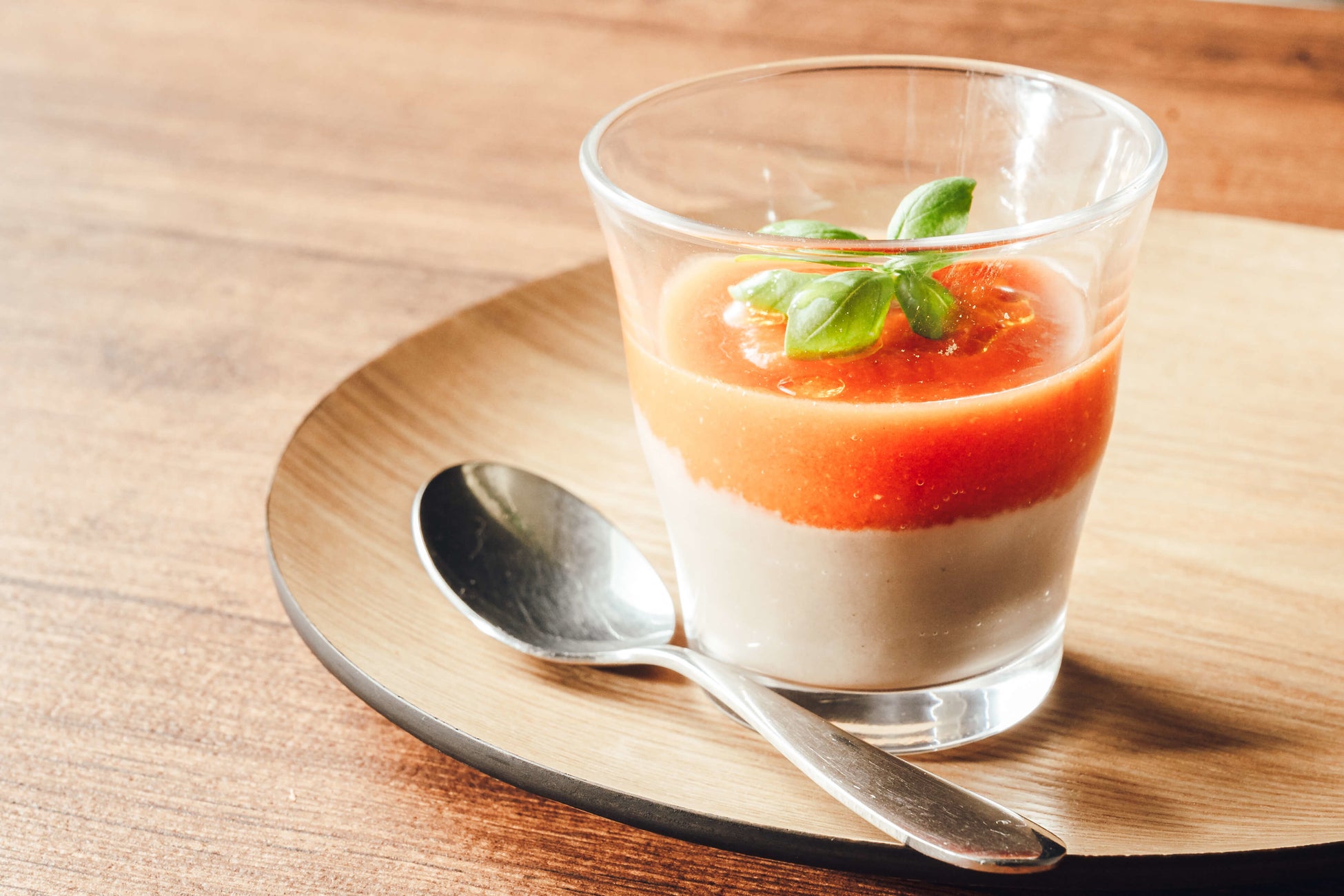 ซุปสเปนแบบเย็น กัซปาโช (Gazpacho) จากเห็ดแชมปิญองและมะเขือเทศ โดยปกติกัซปาโชจะมีส่วนผสมหลักคือมะเขือเทศบดเพียงอย่างเดียว แต่กัซปาโชของที่นี่ จะมีความโดดเด่นด้วยเห็ดและมะเขือเทศที่มีความเข้ากันอย่างลงตัว เหมาะมากที่จะกินในช่วงหน้าร้อน
