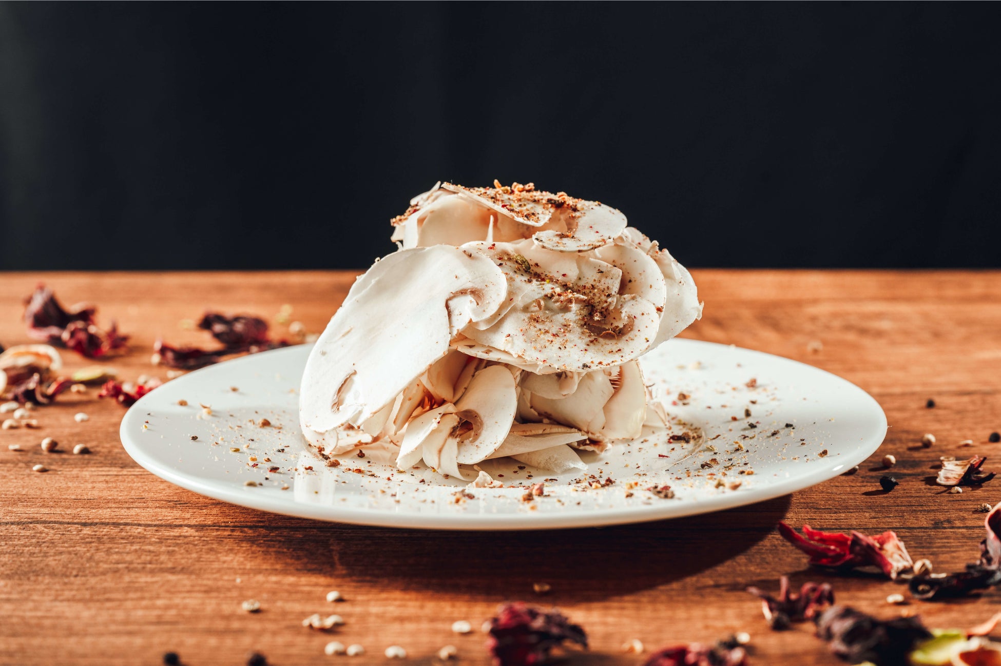 เมนูถัดมาคือ เห็ดแชมปิญองสไลซ์และดอกชบา ความเปรี้ยวจากดอกชบาและรสอูมามิจากอาหารจานนี้ คือความประทับใจแรกหลังได้ลิ้มลอง กลิ่นหอมเตะจมูกจากพริกไทยเสฉวนและเครื่องเทศเผ็ดร้อนจากเนปาล
