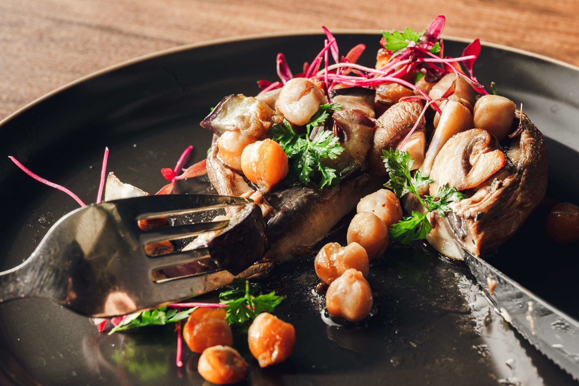 อิ่มอร่อยด้วยเห็ดแชมปิญองขนาดเท่าฝ่ามือ อาหารจานหลักของคอร์ส เห็ดแชมปิญองจัมโบ้กระทะร้อน ถั่วลูกไก่และมะเขือม่วง ยัดไส้เห็ดด้วยถั่วลูกไก่และมะเขือม่วง พร้อมความเผ็ดร้อนและกลิ่นหอมจากเมล็ดยี่หร่า นำเห็ดไปย่างบนกระทะร้อนๆ สารสกัดรสอูมามิจากเห็ดที่โตเต็มไว จะซึมเข้าไปในเนื้อถั่วลูกไก่และมะเขือม่วง ทำให้อาหารมีรสชาติที่เข้มข้นและชุ่มฉ่ํา