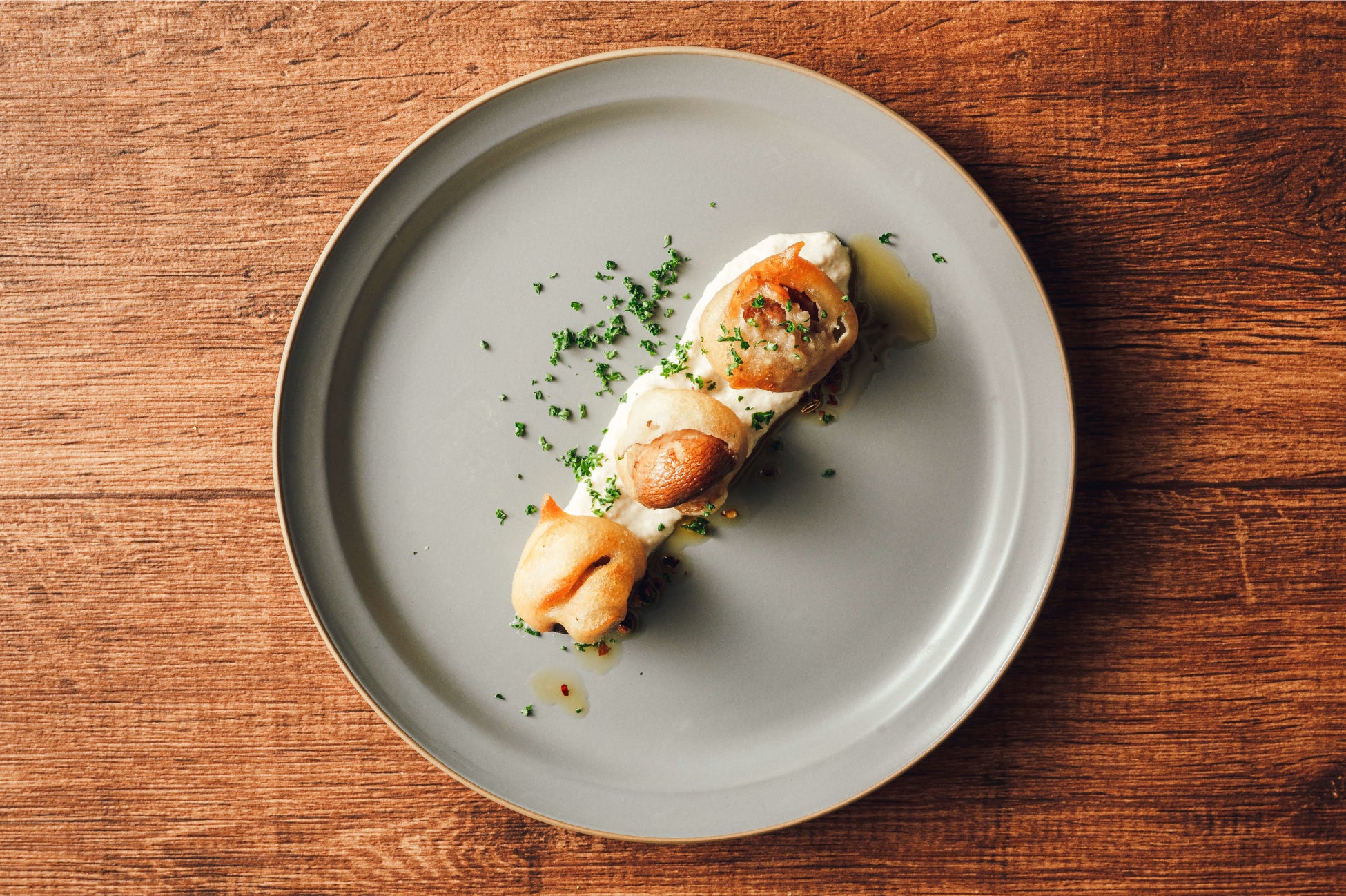 มาเริ่มกันที่เมนูเรียกน้ำย่อยเมนูแรก คือ เห็ดแชมปิญองดองและครีมนมถั่วเหลือง กินโดยการถือก้านใบของผักอองดีฟ (Endive) ที่มีลักษณะคล้ายชามไว้ในมือ ครีมนมถั่วเหลืองที่ค่อยๆ รวมเข้ากับความเปรี้ยวของเห็ดแชมปิญองดอง ผสมผสานกับความขมเล็กน้อยและความสดชื่นของผักอองดีฟ