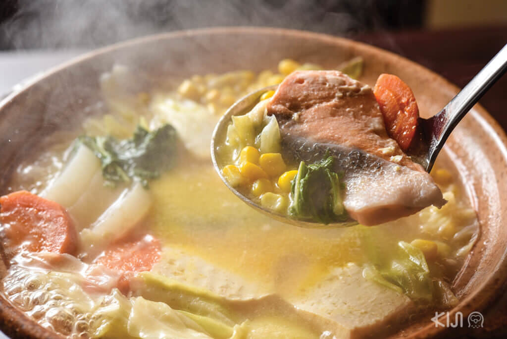 ไหนๆ ก็เดินทางมาจากฮอกไกโด คงต้องแนะนำเมนูประจำถิ่นของเขา อิชิคารินาเบะหรือนาเบะแซลมอน ที่ใช้ชื่อนี้เพราะมาจากชื่อแม่น้ำอิชิคาริที่โด่งดังเรื่องการจับปลาแซลมอน โดยทางร้านยังคงความเป็นออริจินัลได้อย่างครบถ้วน ทั้งแซลมอนชิ้นใหญ่ ผักชนิดต่างๆ อย่างกะหล่ำปลี หัวไชเท้า เต้าหู้ แครอท ต้นหอมญี่ปุ่น ผักมิซูน่า ที่ขาดไม่ได้คือข้าวโพด มันฝรั่ง และเนย จึงทำให้น้ำซุปมีความหวานหอมเข้มข้นและมีเอกลักษณ์ชัดเจนในแบบฮอกไกโด