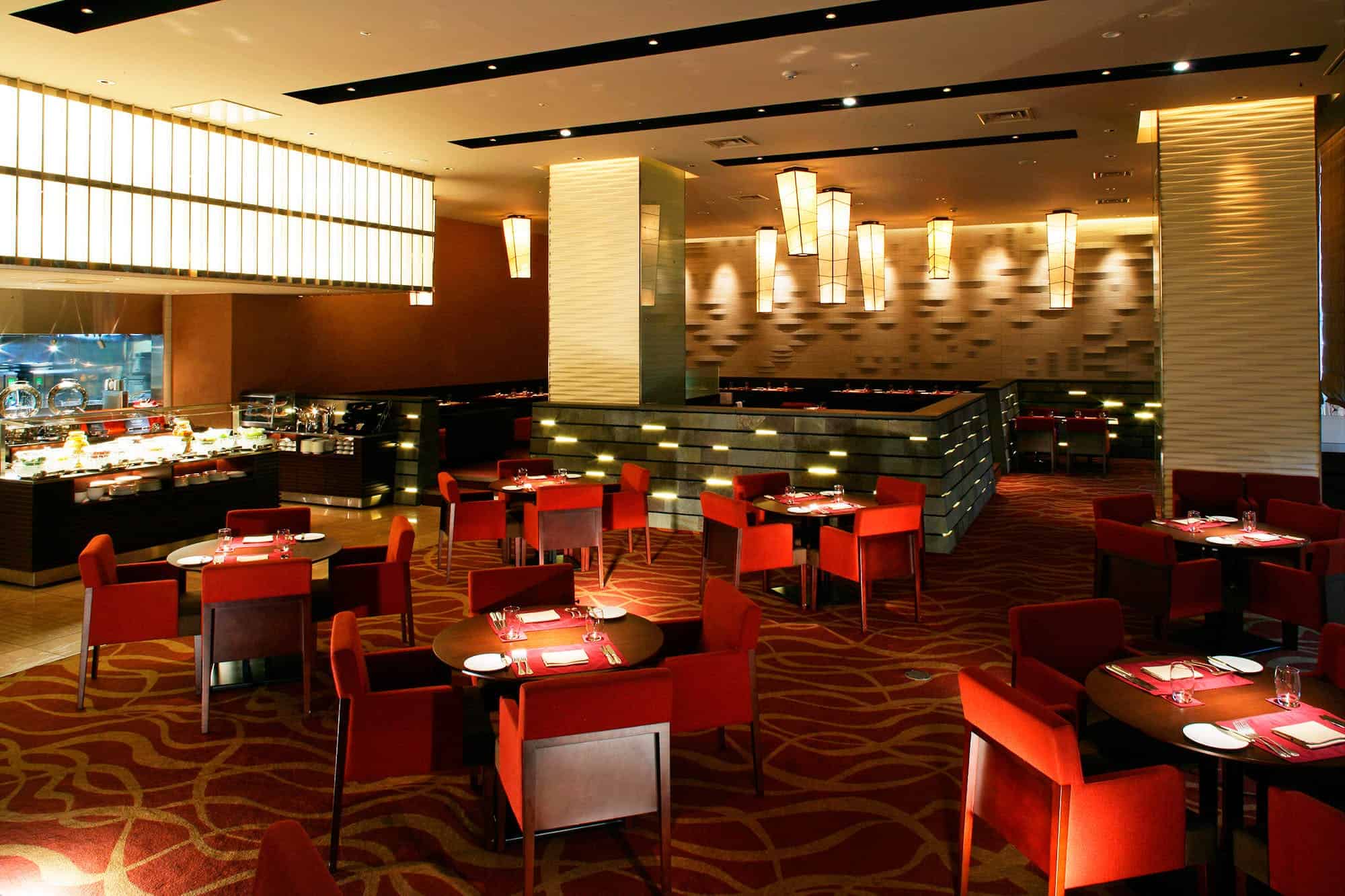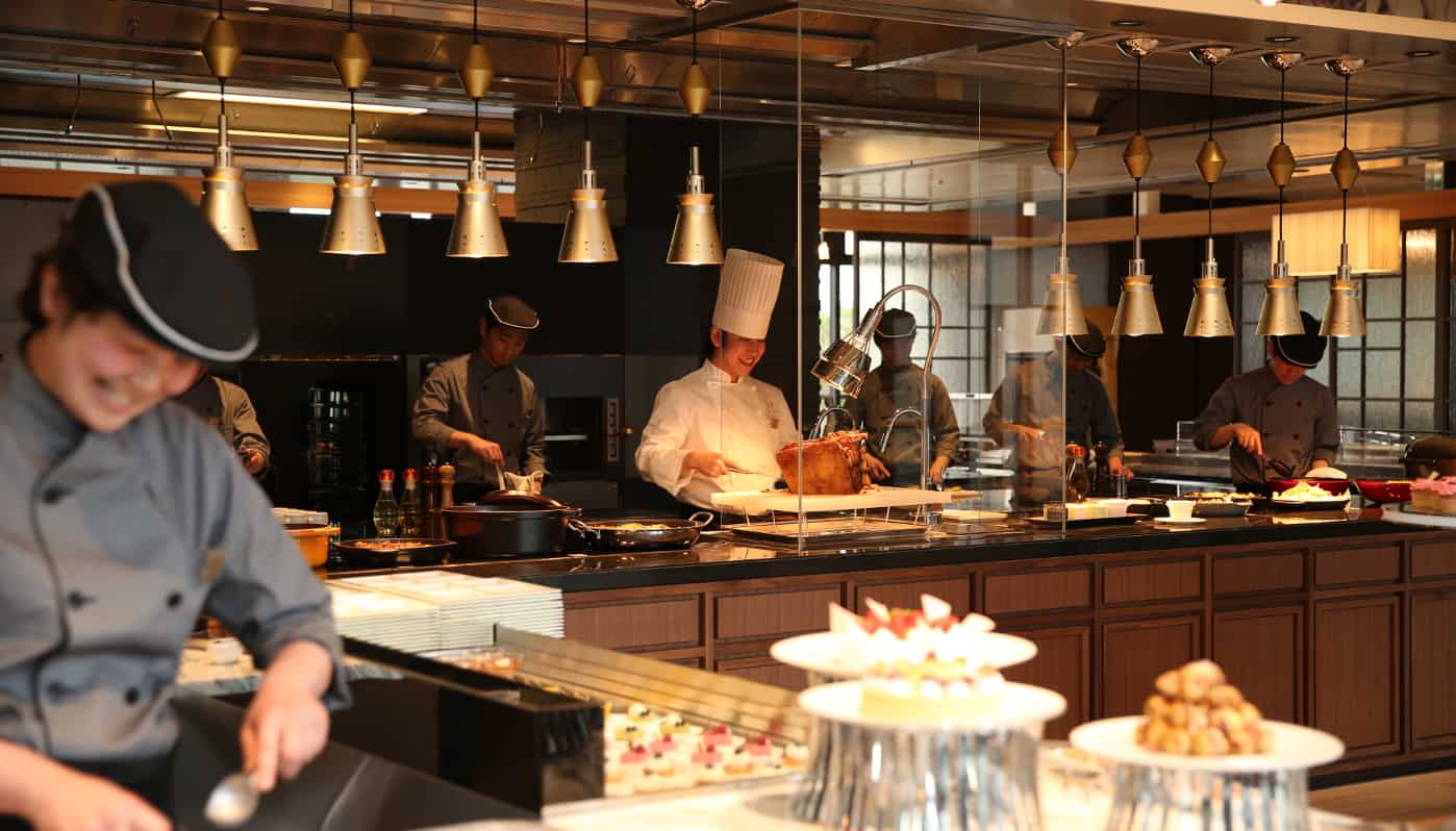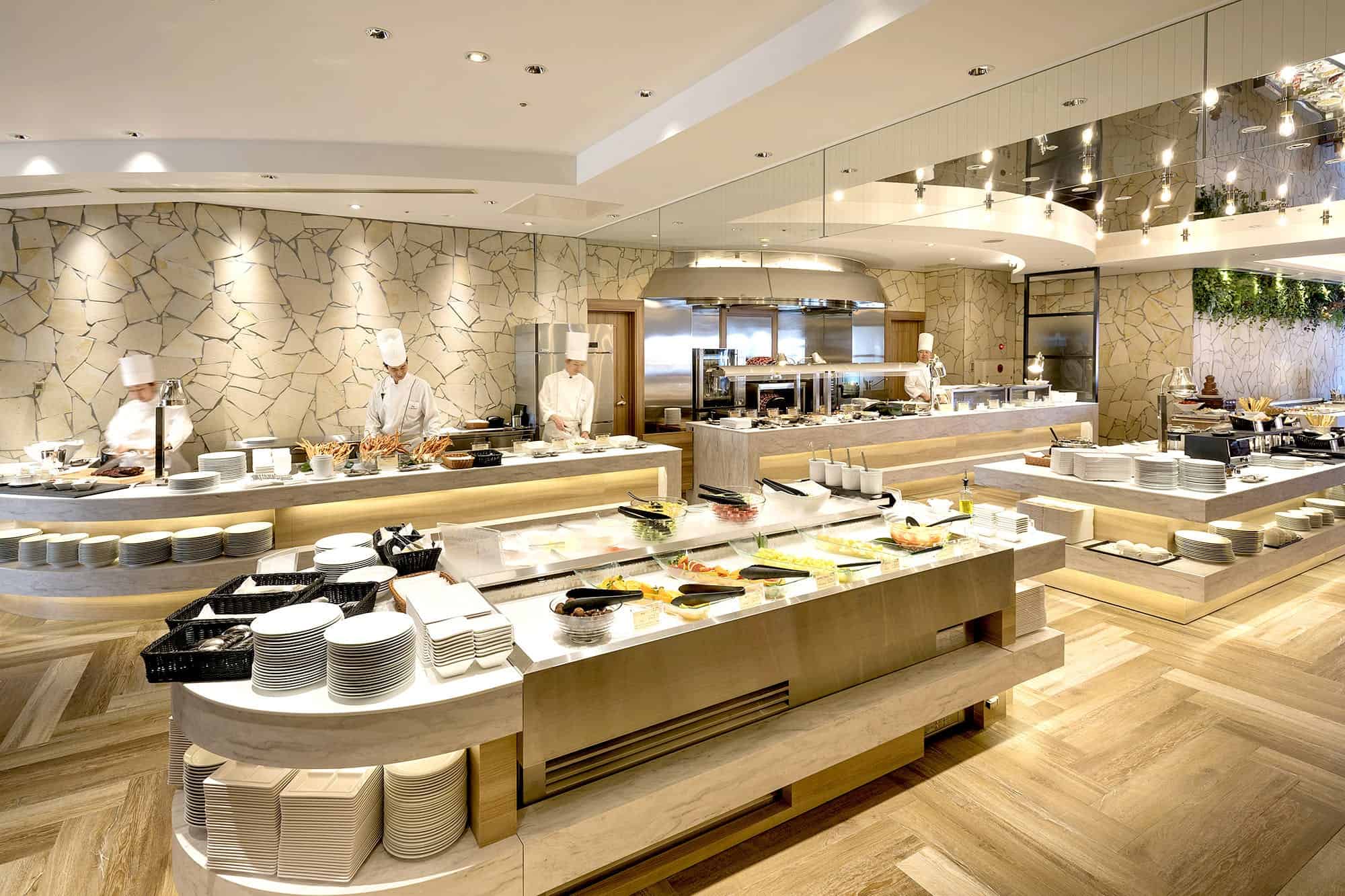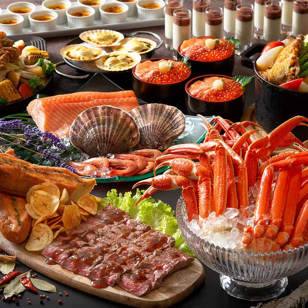 บุฟเฟ่ต์ของที่นี่แบ่งออกเป็น 3 รอบ เช้า-กลางวัน-เย็น สำหรับมื้อเช้า (6:30-10:00 น.) ราคาคนละ 2,900 เยน เน้นอาหารฝรั่งที่ทำจากวัตถุดิบของญี่ปุ่น มีเมนูเด่นคือไข่เบเนดิกต์ที่เชฟภูมิใจนำเสนอ มื้อกลางวัน (11:30-15:00 น.) เป็นเมนูที่เปลี่ยนตามแต่ละฤดูกาลซึ่งราคาต่อคนเริ่มตั้งแต่ 3,000 เยน ส่วนมื้อเย็น (17:30-21:00 น.) เป็นบุฟเฟ่ต์สุดอลังการที่มีทั้งอาหารญี่ปุ่นและอาหารตะวันตกหรูหรา ราคาต่อคนเริ่มตั้งแต่ 4,500 เยน ขึ้นอยู่กับอีเว้นท์ที่จัดในช่วงที่ไปใช้บริการ เช่น เทศกาลอาหารทะเลฮอกไกโด ฯลฯ