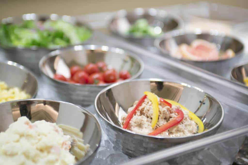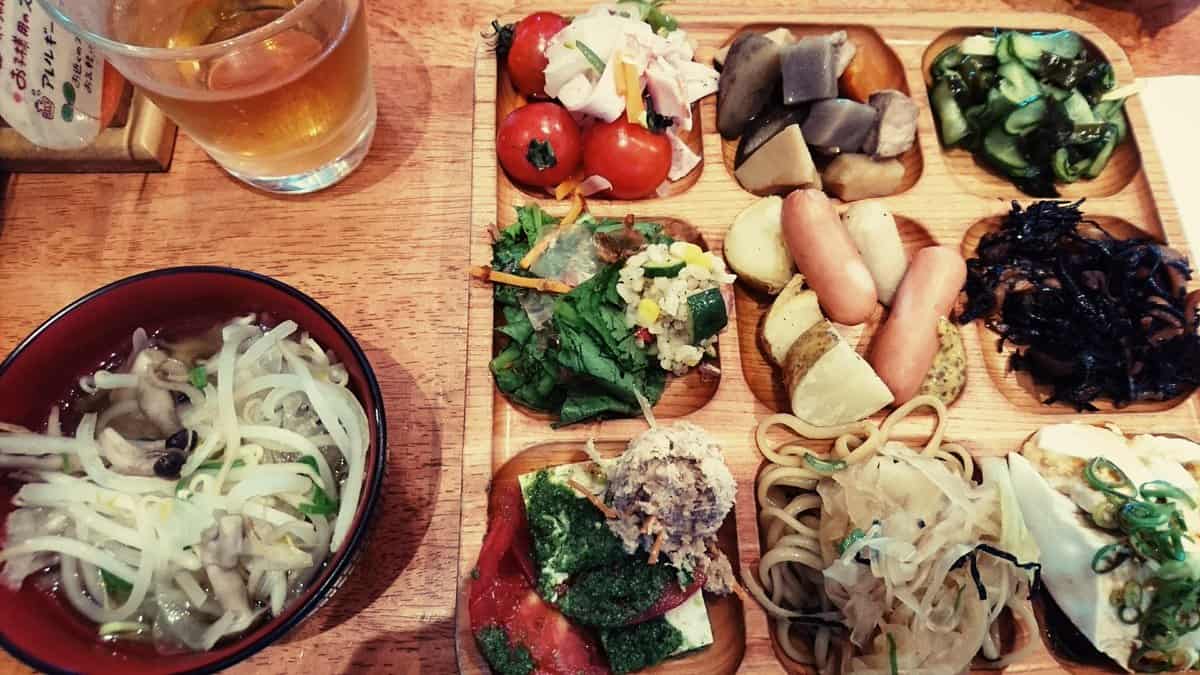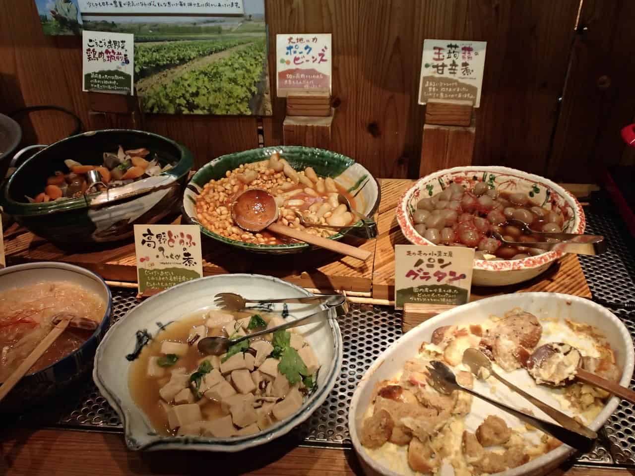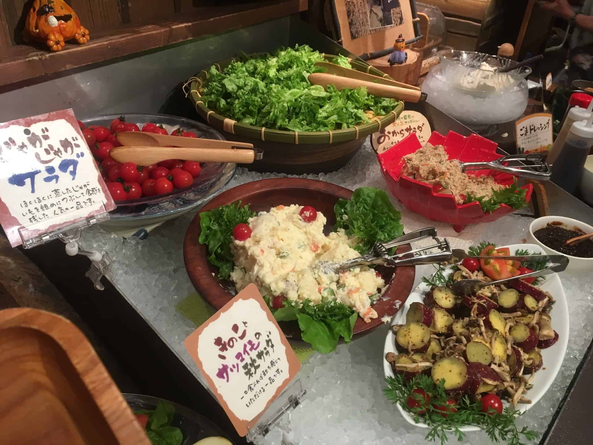 บุฟเฟ่ต์ของที่นี่แทบทั้งหมดเป็นสไตล์พืชผักสวนครัวที่สดใหม่ และมีหลากหลายชนิดให้เลือกจนตาลาย ในขณะเดียวกันก็มีแฮมและไส้กรอกที่ทางร้านทำเองอยู่ด้วย เรียกได้ว่าอิ่มจนแน่นแต่ไม่รู้สึกผิดกับการกินบุฟเฟ่ต์เลยสักนิด เพราะทั้งหมดนั้นล้วนแต่ดีต่อสุขภาพ มื้อกลางวันราคาคนละ 1,912 เยน สามารถรับประทานได้ 1 ชั่วโมงครึ่ง ส่วนมื้อเย็นราคาคนละ 2,376 เยน สามารถรับประทานได้ 2 ชั่วโมง