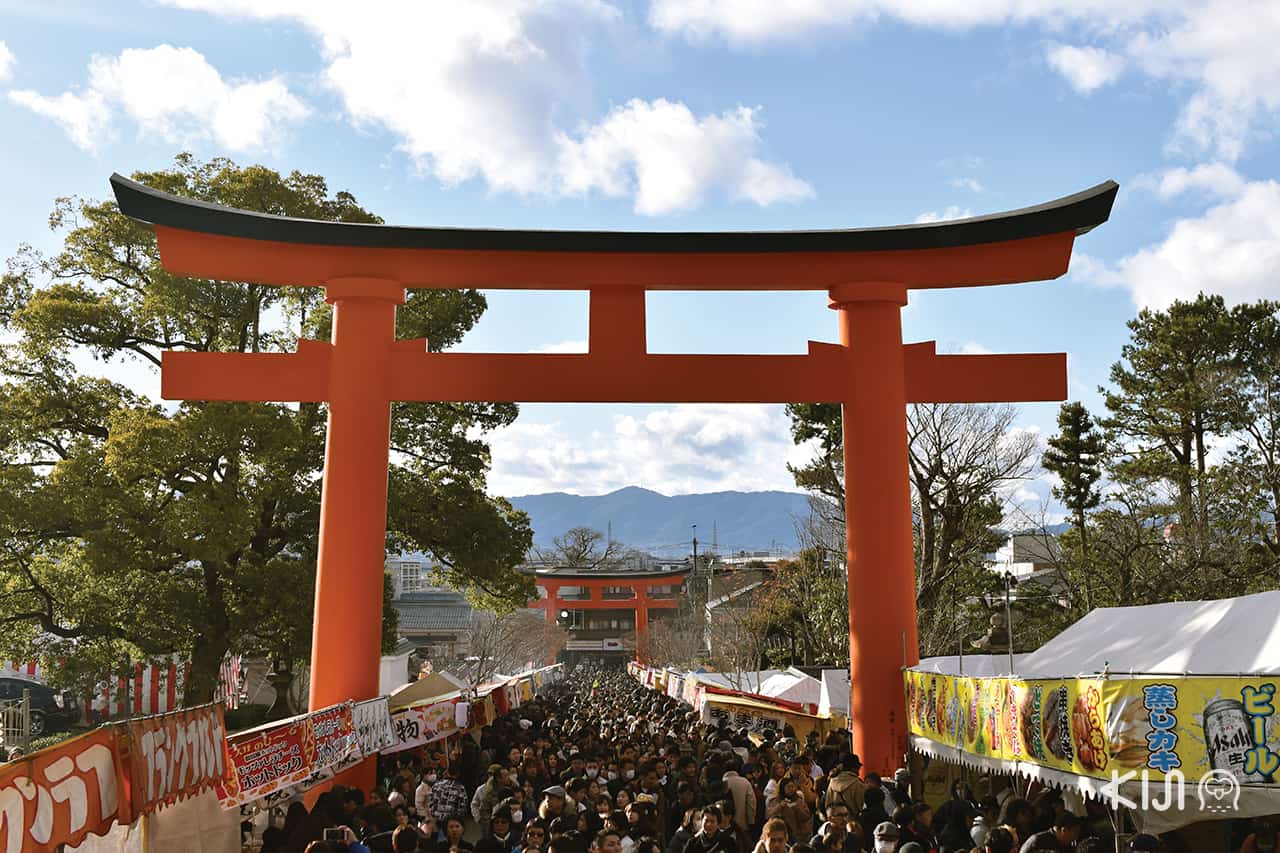 ด้วยความที่ศาลเจ้าฟูชิมิอินาริเปิดตลอด 24 ชั่วโมง จึงทำให้มีผู้คนหลั่งไหลเข้ามาอย่างเนืองแน่น อีกทั้งมีพิธีกรรมแบบญี่ปุ่นที่น่าสนใจให้ได้สัมผัสตั้งแต่วันที่ 31 ธันวาคม เช่น Oharai-shiki พิธีชำระล้างบาปช่วงครึ่งหลังของปีเพื่อเริ่มต้นปีใหม่อย่างสดใสบริสุทธิ์ หรือ Saitan-sai ในช่วงเช้าของวันที่ 1 มกราคม พิธีอธิษฐานขอพรให้มีแต่ความสงบสุขเกิดขึ้น ผลผลิตอุดมสมบูรณ์ และเศรษฐกิจดี เป็นต้น อีกซีนที่ไม่พูดถึงไม่ได้คือเสาโทริอิสีแดงสดยาวเป็นระยะทาง 5 กม. ว่ากันว่าหากเดินลอดเสาโทริอิสีแดงจากต้นทางจนสุดปลายทางแล้วจะโชคดี