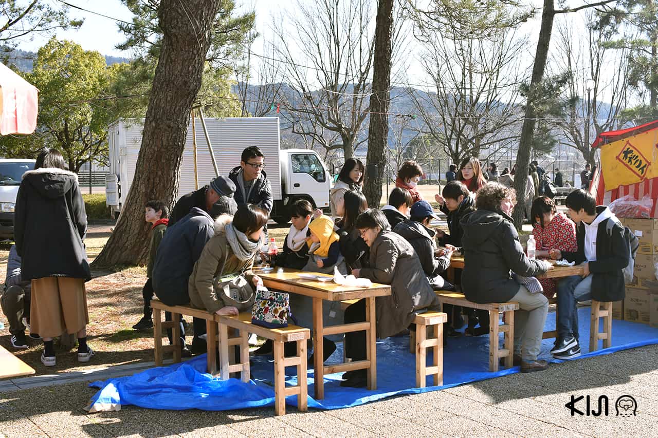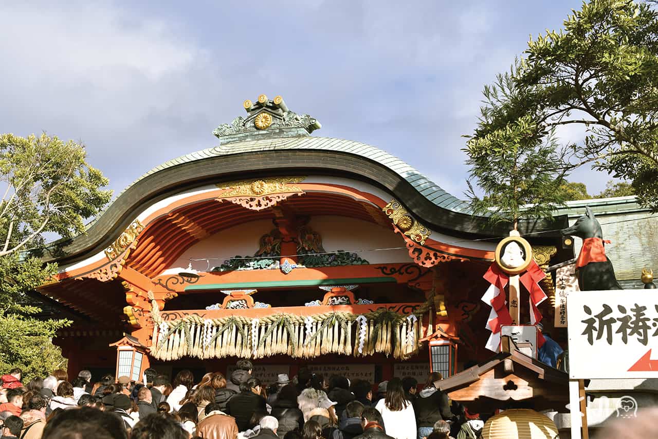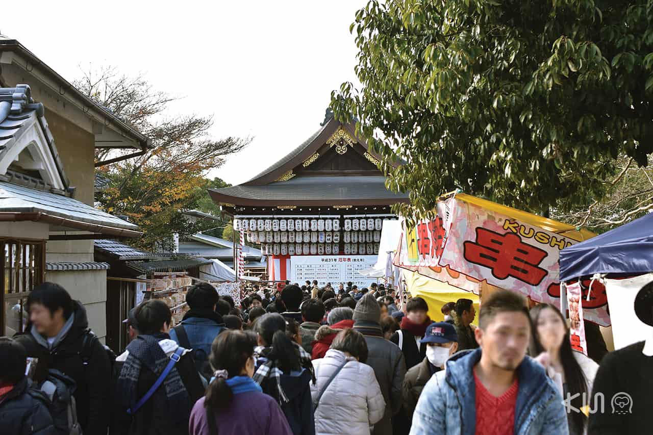 โดยปกติในวันปีใหม่พ่อค้าแม่ค้าญี่ปุ่นพากันมาตั้งยะไตเปิดขายอาหารกันตรงถนนทางเข้าวัดหรือศาลเจ้า แต่ที่เราสังเกตได้คือที่ศาลเจ้าแห่งนี้มียะไตเยอะกว่าที่อื่น จะเดินไม่ถึงตัวศาลเจ้าสักทีก็เพราะต้องแวะชิมอาหารคาวหวานที่ยะไตตามรายทางก่อนนี่แหละ เพลินที่สุด