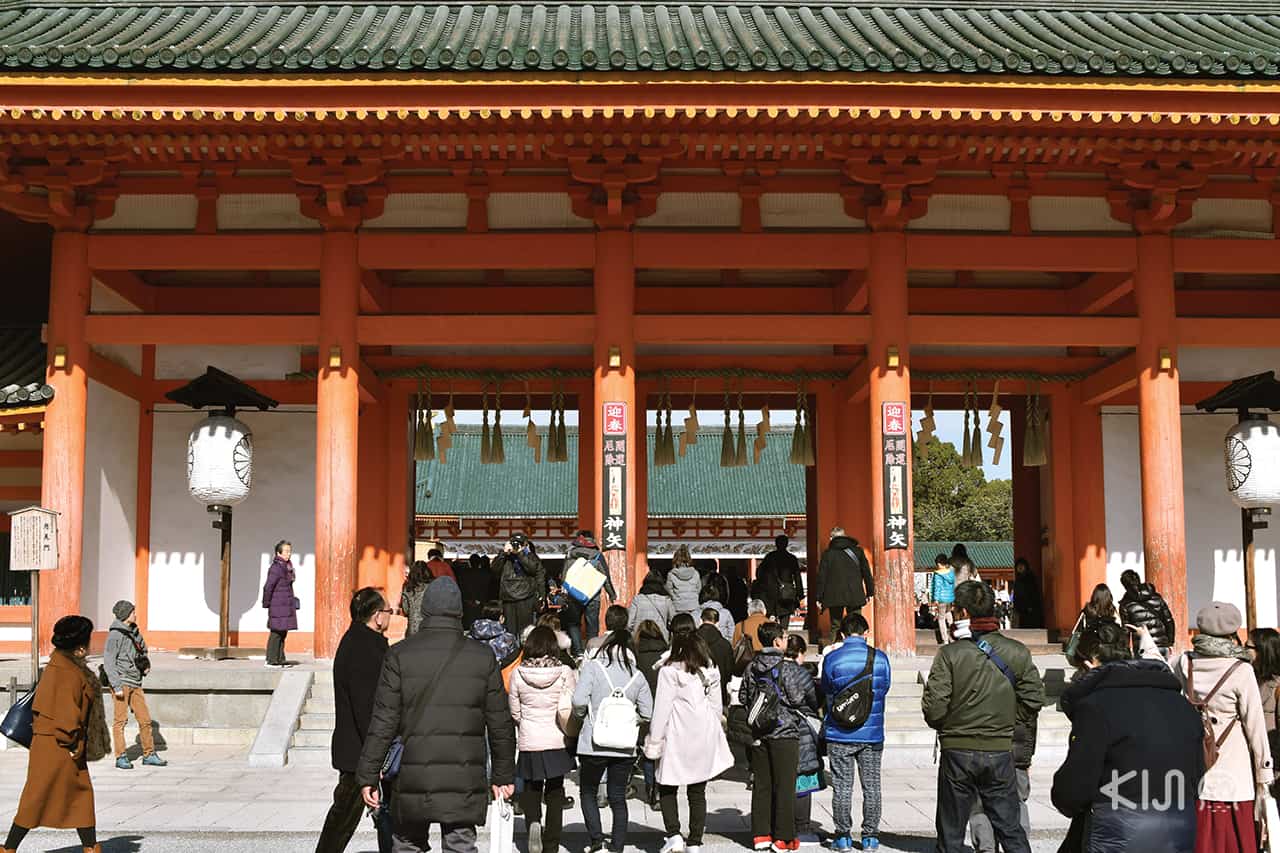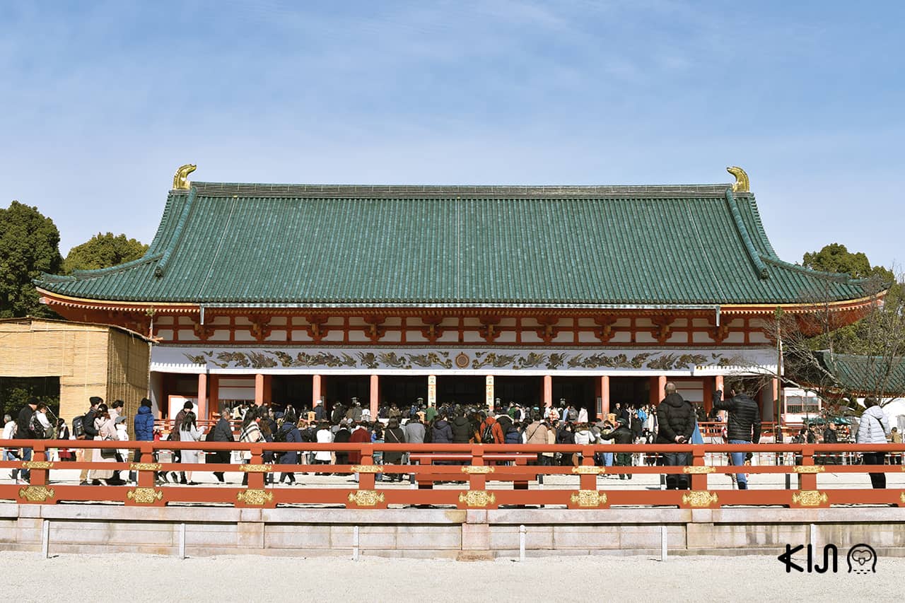 เมื่อเดินผ่านเสาโทริอิเข้ามาถึงด้านในจะเห็นอาคารสีแดงค่อนข้างแปลกตากว่าศาลเจ้าอื่นๆ ที่พบประวัติบอกว่าตัวอาคารหลักของศาลเจ้านั้นไม่ธรรมดา เนื่องจากมีต้นแบบจากพระราชวังในสมัยเฮอันนู่นแน่ะ ในวันปกติศาลเจ้าแห่งนี้จะปิดตอน 5 โมงเย็น แต่ช่วงเทศกาลปีใหม่ที่ศาลเจ้าเฮอันจะเริ่มคึกคักตั้งแต่วันที่ 31 ธันวาคม จะมีจัดแสดงโคมไฟส่องสว่างต้อนรับวันปีใหม่ตลอดคืน ช่วงเช้าตรู่ของของวันใหม่จะมีพิธี Urayasu no Mai คล้ายกับการร่ายรำโดยนักบวช และแน่นอนว่ามีผู้คนหลั่งไหลมาฮัทสึโมเดะตลอดทั้งวัน