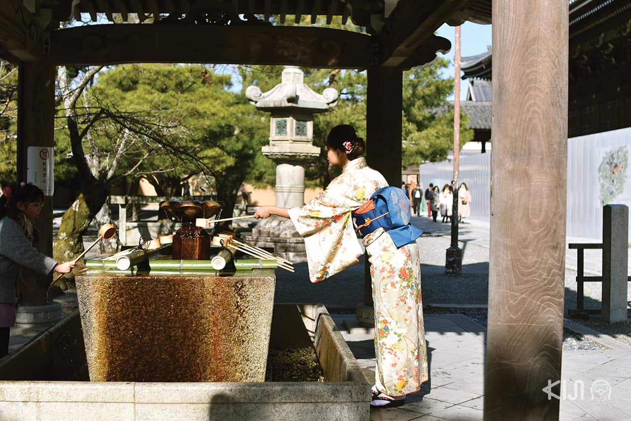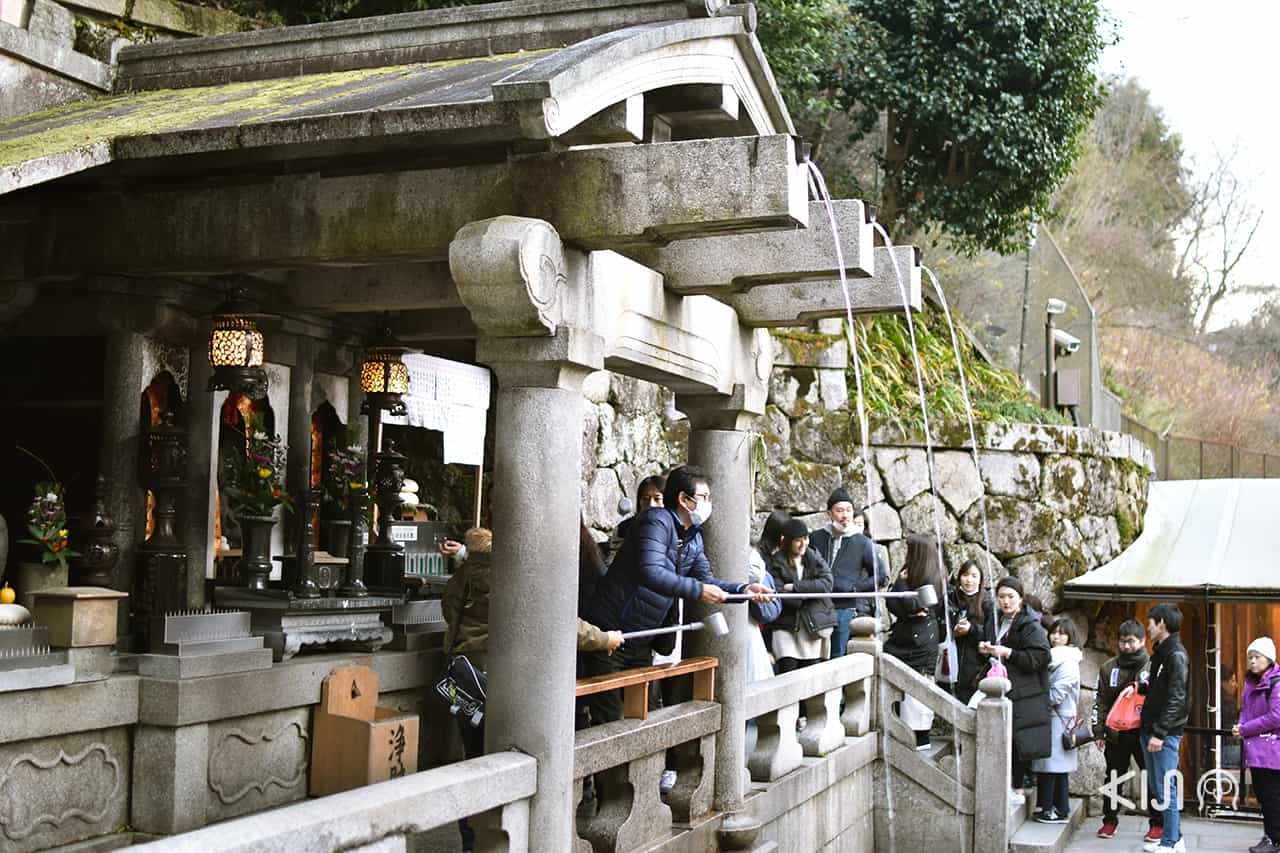 แม้ตอนนี้ตัววิหารหลักจะปรับปรุงอยู่ (ปิดซ่อมแซมจนถึงปี ค.ศ. 2020) แต่ในวันขึ้นปีใหม่ผู้คนก็ยังหลั่งไหลเข้ามาขอพรกันและดื่มน้ำใสสามสายกันอย่างคึกคัก คนญี่ปุ่นเชื่อว่าเป็นสายน้ำศักดิ์สิทธิ์ ใครได้ดื่มจะสมปรารถนาในเรื่องที่แตกต่างกันไปตามแต่ละสายเรียงจากซ้ายไปขวา (หันหน้าเข้าศาลา) ได้แก่ เรื่องการศึกษา ความรัก และสุขภาพแข็งแรงตามลำดับ ส่วนวิธีการดื่มเราแนะนำให้ใช้กระบวยรองน้ำ แล้วเทน้ำจากกระบวยใส่มือดื่ม
