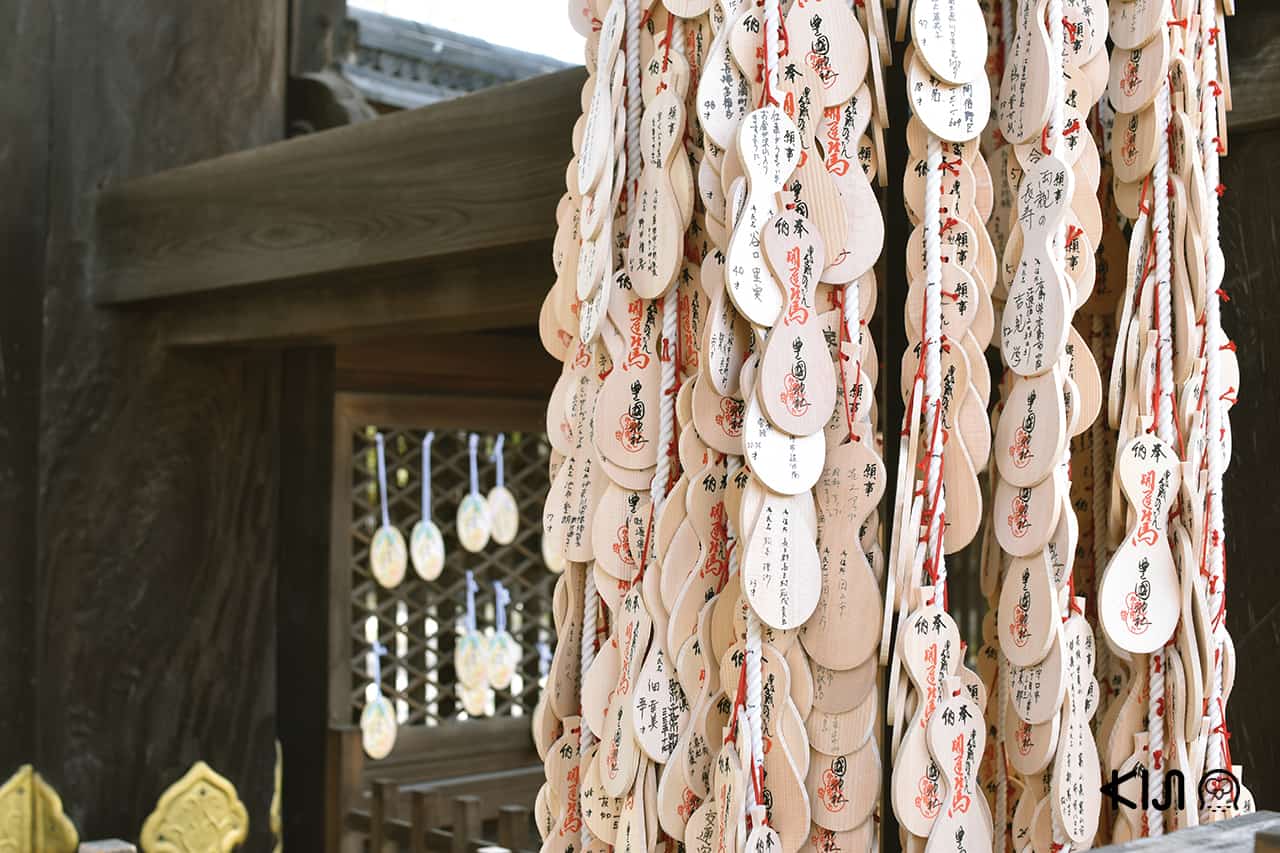 ประตูไม้ Karamon ที่ด้านหน้าศาลเจ้าก็มีเรื่องราวเล่าต่อกันมาว่า ดั้งเดิมประตูนี้ถูกสร้างขึ้นเพื่อใช้ที่ Fushimi Castle ปราสาทที่ฮิเดโยชิอาศัยอยู่ หลังจากปราสาทถูกรื้อถอนประตูก็ถูกย้ายมาไว้ที่ Nijo Castle, Konchi-in Temple และ Nanzen-ji Temple ตามลำดับ และสุดท้ายมาจบลงที่ศาลเจ้าโทโยคุนิในปี ค.ศ. 1876 ช่วงปีใหม่คนท้องถิ่นนิยมมาเขียนแผ่นป้าย (Ema) ขอพรกัน ว่ากันว่าแผ่นป้ายของที่นี่แปลกไม่เหมือนที่ไหน ถ้ามีโอกาสแนะนำให้เข้าไปเขียนขอพรกันดู