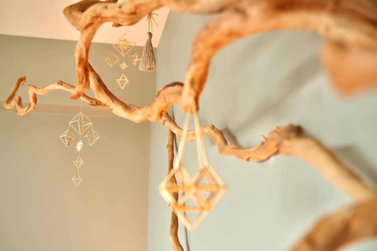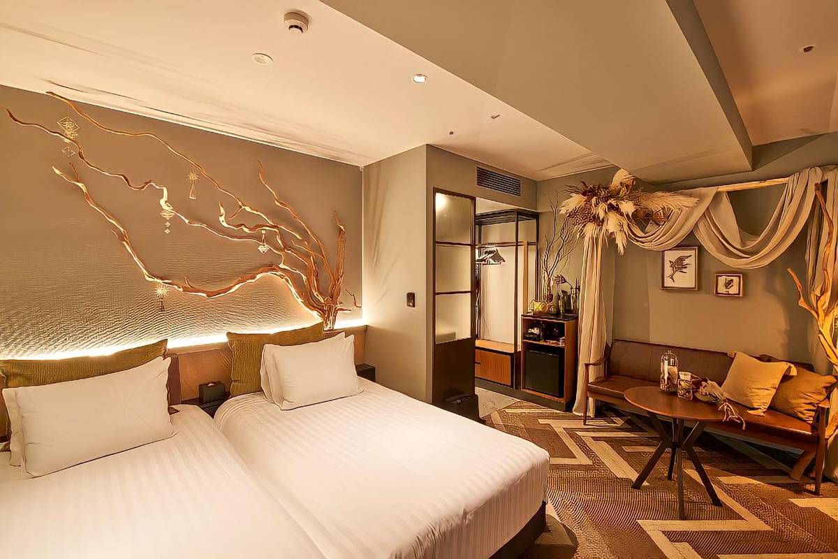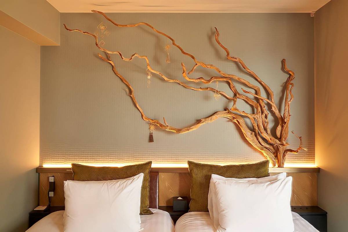 กลับมาที่ห้องพักกันต่อ จุดที่สะดุดตามากที่สุดจุดหนึ่งคือบริเวณหัวเตียง เพราะมีการตกแต่งด้วยไม้แห้งที่ตั้งชื่อว่า Stream Tree ด้วยรูปทรงเด่นคล้ายกับลำธาร กิ่งก้านที่โค้งมนราวกับสายน้ำที่กำลังไหลอยู่บนผนังห้อง เป็นงานศิลปะจากธรรมชาติที่ช่างงดงามเอาเสียจริงๆ และยิ่งไปกว่านั้นเมื่อไฟสีส้มบนหัวเตียงได้สว่างขึ้น ก็จะทำให้งานชิ้นนี้สวยขึ้นไปเป็นกองเลยล่ะ