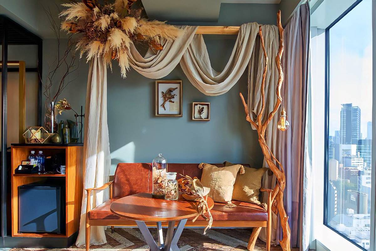 มาต่อกันที่อีกมุมหนึ่งของห้องพักนี้กันดีกว่า เป็นมุมที่มีชื่อว่า Memory Arch ที่ชวนให้มานั่งสร้างความทรงจำดีๆ ไปด้วยกัน โดยบริเวณรอบๆ จะรายล้อมไปด้วยบรรยากาศของดอกไม้แห้งที่มีให้ชื่นชมอยู่หลายแบบ ไม่ว่าจะเป็นดอกไม้แห้งในโหลแก้วเอย ช่อดอกไม้เอย หรือจะเป็นดอกไม้แห้งในกรอบที่ติดอยู่บนฝาผนัง บวกไปกับผ้าม่านสีครีมที่ห้อยระย้าและโคมไฟดวงน้อยๆ ต่างก็ให้อารมณ์ที่อบอุ่นใจเหลือเกิน