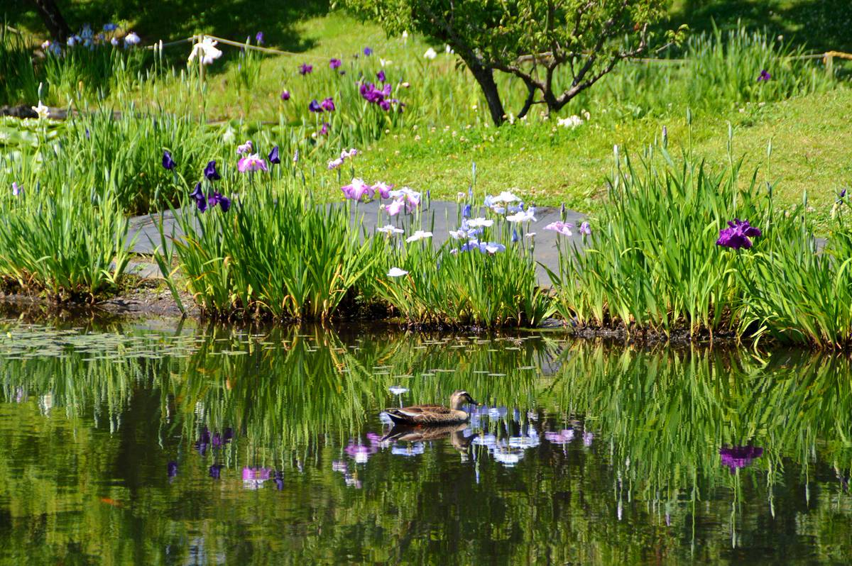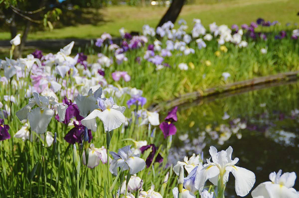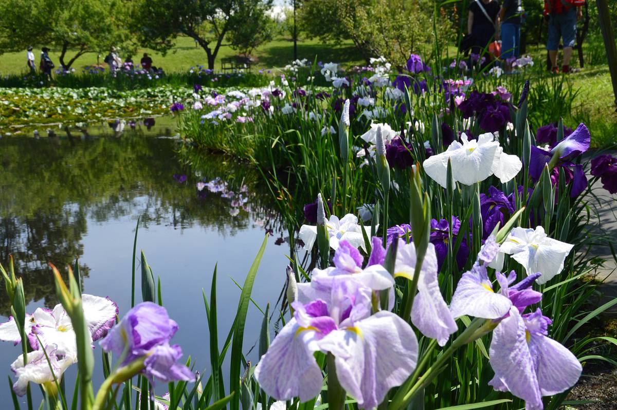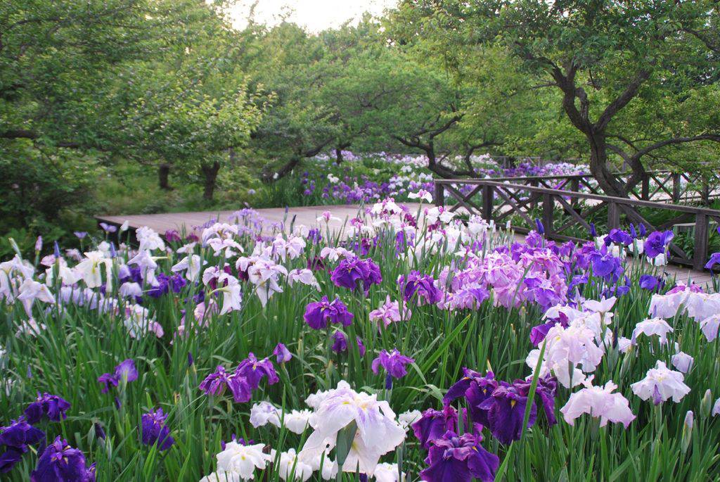 ดอกฮานะโชบุ (ไอริสญี่ปุ่น) เป็นดอกไม้ที่เจริญเติบโตได้ดีในบริเวณกึ่งเปียกกึ่งแห้ง โดยปกติแล้วคนส่วนใหญ่มักจะปลูกไว้ในพื้นที่ที่ราบเรียบ แต่ความพิเศษของสวนนี้คือ จะปลูกดอกฮานะโชบุไว้ที่บริเวณริมลำธารหรือไม่ก็บริเวณใกล้กับบ่อน้ำ ทำให้เราได้เพลิดเพลินไปกับองค์ประกอบศิลป์ ระหว่างภาพสะท้อนดอกฮานะโชบุบนผิวน้ำกับดอกซุยเร็นที่ลอยอยู่เหนือน้ำบริเวณสระชูเกอิ (Shukei Pond) เป็นทัศนียภาพอันโดดเด่นและงดงามที่หลายคนชื่นชอบ ช่วงที่เหมาะกับการรับชมดอกไม้ชนิดนี้คือประมาณกลางเดือนถึงปลายเดือนมิถุนายน