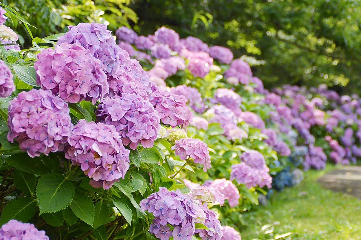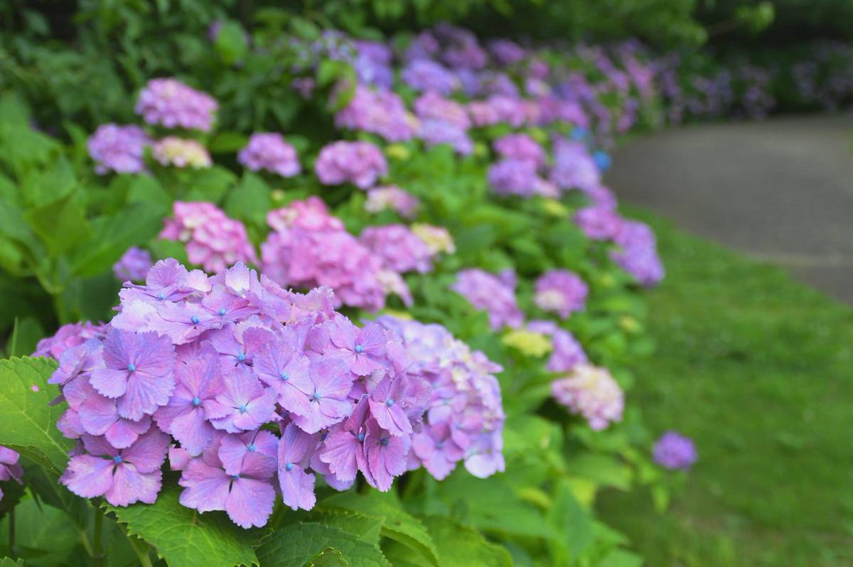 ในช่วงเวลาเดียวกัน ดอกไม้ประจำฤดูฝนอย่างดอกอาจิไซ (ไฮเดรนเยีย) กว่า 500 ต้น ก็ถูกแต่งแต้มด้วยสีสันอันสวยงามเช่นกัน บอกได้เลยว่าจะหันไปทางไหนหรือเดินไปส่วนไหนของที่นี่ ก็เต็มไปด้วยดอกไม้หลากสี โดยดอกไม้ชนิดนี้จะมีสีสวยงามมากที่สุดในช่วงกลางเดือนไปจนถึงปลายเดือนมิถุนายน มีการปลูกล้อมรอบบริเวณสวนเคย์ริวโนะไบเอน ช่วยเติมสีสันให้กับวันที่อากาศแจ่มใส