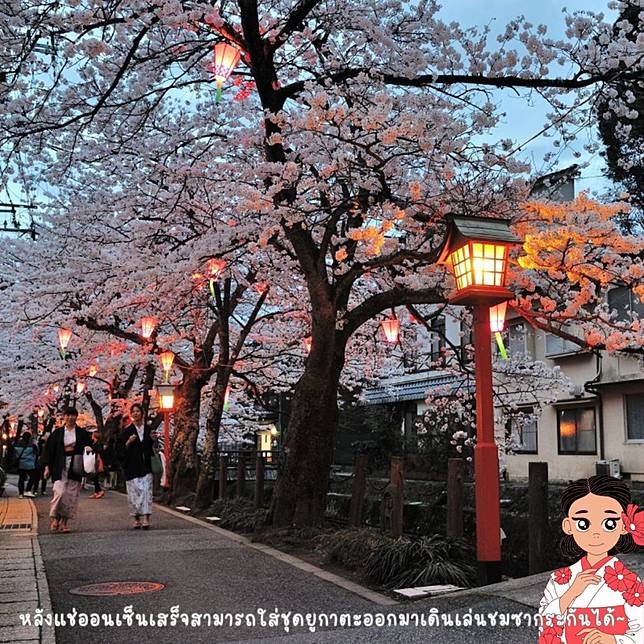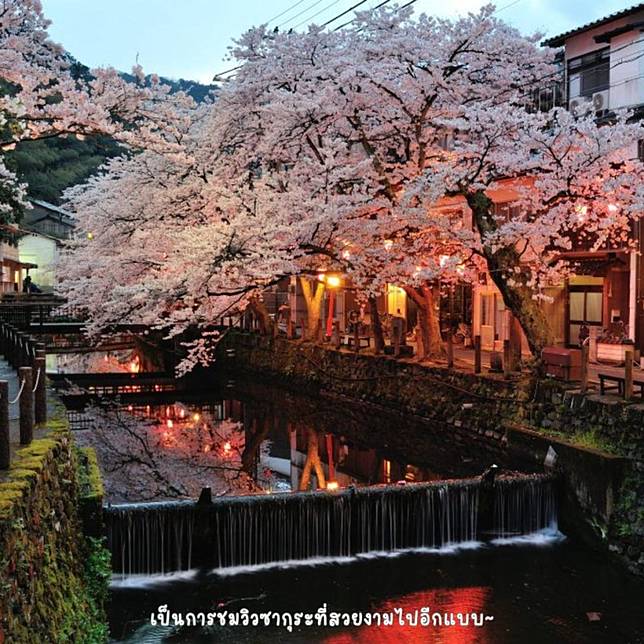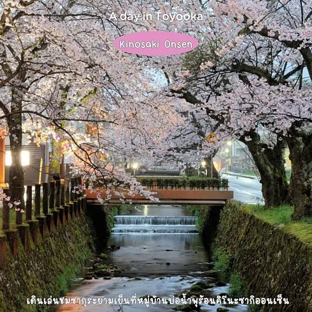 หลังจากเที่ยวมาทั้งวันแล้ว ก็มาปิดท้ายด้วยการแวะแช่ออนเซ็นผ่อนคลายความเหนื่อยล้ากันได้ที่หมู่บ้านบ่อน้ำพุร้อนคิโนะซากิออนเซ็น (Kinosaki Onsen) ซึ่งที่นี่นั้นเรียกได้ว่าเป็นต้นกำเนิดของธรรมเนียมออนเซ็นฮ็อปปิ้งเลยก็ว่าได้ อีกทั้งออนเซ็นชื่อดังตามตำนานทั้ง 7 แห่งก็ล้วนมีเสน่ห์ที่แตกต่างกันไป ส่วนใครที่อยากเดินชมซากุระสวยๆ ที่หมู่บ้านแห่งนี้ก็มีจุดชมซากุระสวยๆ ตามทางเดินใกล้กับบ่อน้ำพุออนเซ็นให้ชมเช่นกัน คาดว่าฤดูของการชมซากุระของที่นี่ในปีนี้ดอกซากุระจะเบ่งบานเต็มที่ในช่วง 21-25 มีนาคม ในช่วงเย็นก็จะมีการประดับไฟสวยงามเหมาะแก่การใส่ชุดยูกาตะเดินชมและถ่ายรูปเล่นอย่างยิ่ง หากเดินผ่านตามร้านขนมหวานก็จะเห็นเมนูประจำฤดูกาลให้ได้ลองแวะซื้อแวะชิมกันอีกด้วย