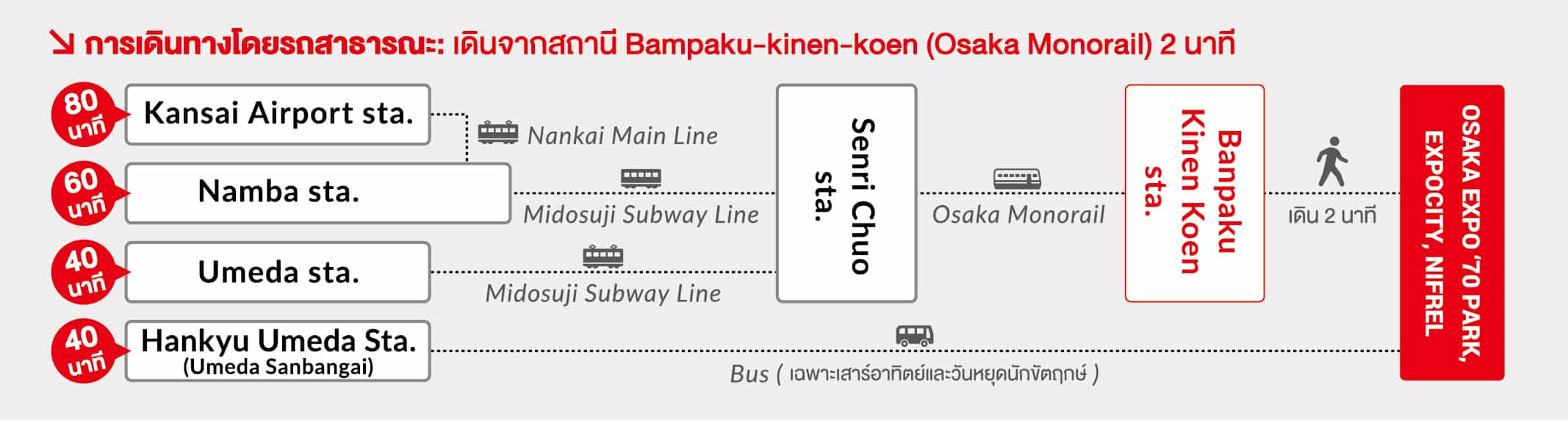 จาก Hankyu Umeda Station: โดยสารรถบัสยาวไปถึง Banpakukinenkoen Station ใช้เวลาราวๆ 40 นาที (เฉพาะเสาร์-อาทิตย์และวันหยุดนักขัตฤกษ์)