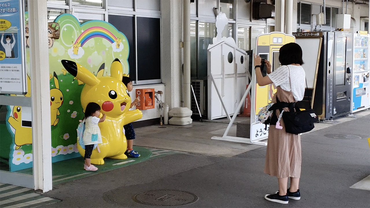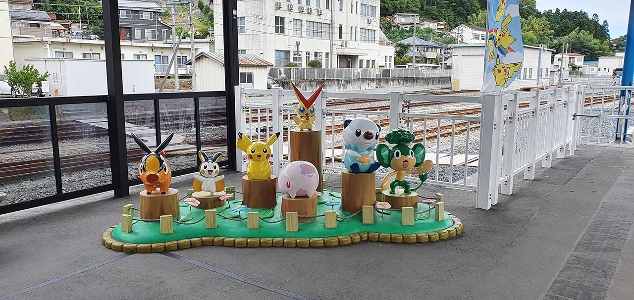 แน่นอนว่าป้ายสถานีนี้ก็มีโปเกมอนประดับอยู่ แต่เมื่อเดินมาอีกนิด จะเจอแท่นรถไฟจำลองที่เรายื่นหน้าเข้าไปถ่ายรูปได้ด้วย และเดินไปอีกนิดจะเจอเหล่าโปเกมอนยืนต้อนรับอย่างแป้นแล้น ถ่ายรูปเพลินมากก่อนออกไปนอกสถานี ซึ่ง… มีปิกาจูตัวเบ้อเริ่มรอเราอยู่อีกหนึ่งตัว!