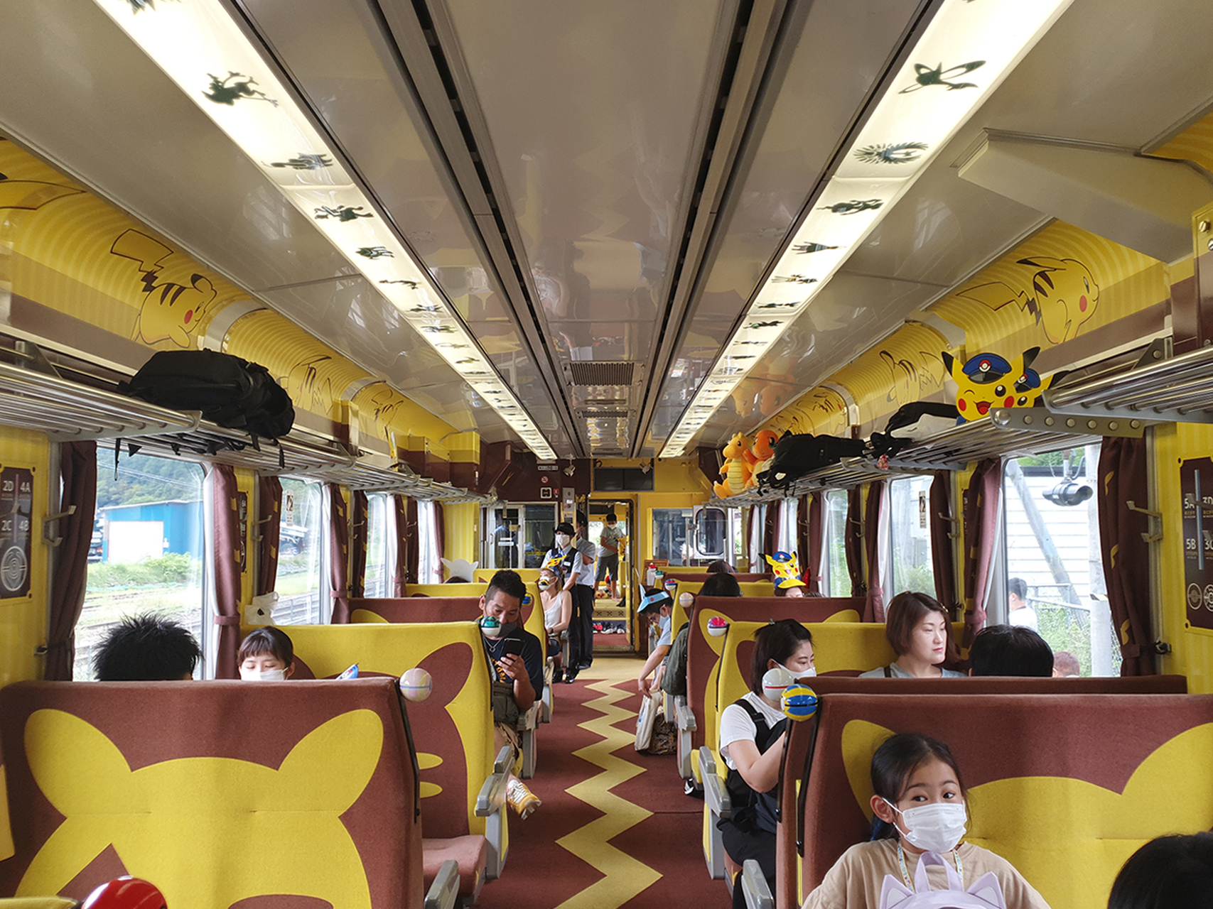 ทันทีที่ก้าวเท้าเข้ามาด้านในจะได้พบกับสีเหลืองสดใสและปิกาจูอยู่เต็มไปหมดทั้งเบาะที่นั่ง ผ้าม่าน เพดาน ผนัง หรือแม้แต่ในห้องน้ำ! ลายบนพื้นเป็นรูปสายฟ้าหางของปิกาจูชวนให้รู้สึกคึกคักเวลาเดิน โปเกมอนรับบทเป็นที่จับกันล้มบนรถไฟ โดยแปะอยู่ที่ปลายพนักที่นั่งฝั่งทางเดิน ที่นั่งส่วนมากเป็นแบบหันหน้าเข้าหากัน ถ้าเดินทาง 4 คนก็ได้นั่งด้วยกันพอดี ทั้งนี้ทั้งนั้นที่นั่งทั้งหมดบนรถไฟขบวนนี้เป็นแบบจองที่นั่งล่วงหน้าทั้งหมด ใครคิดจะมา ต้องเร็วนะ