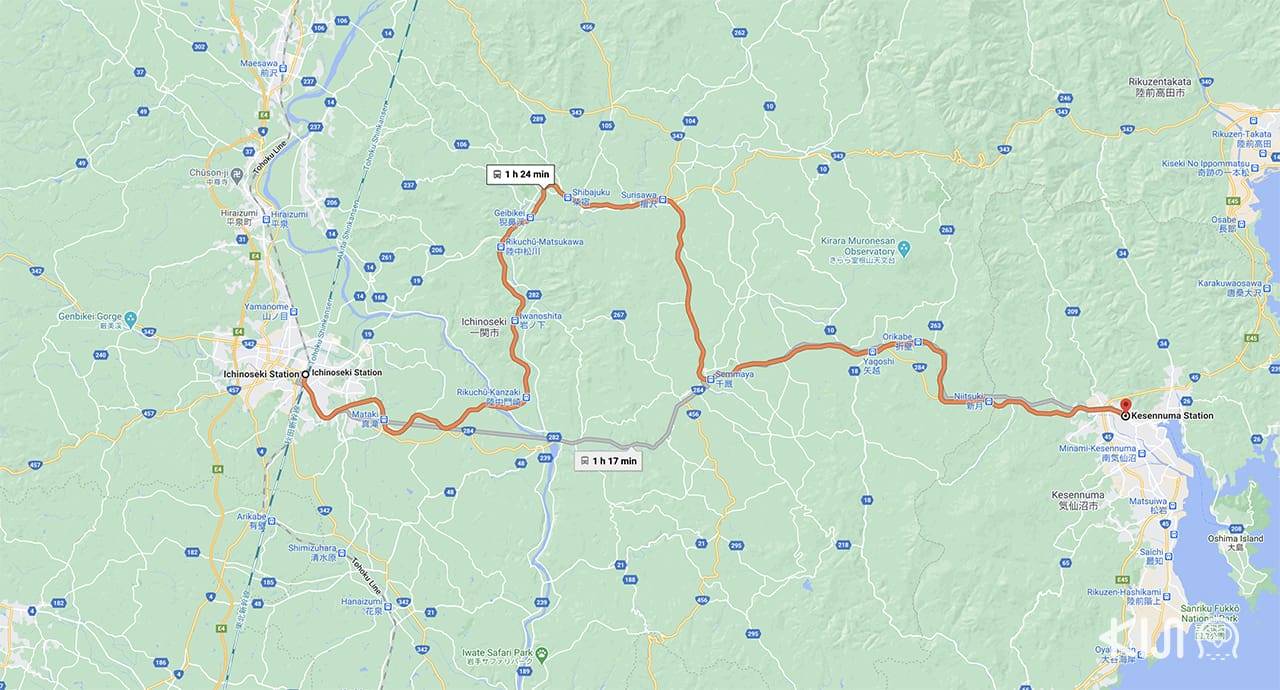 ระหว่างสถานีอิชิโนะเซกิ (Ichinoseki Station) จังหวัดอิวาเตะ (Iwate) กับสถานีเคเซ็นนุมะ (Kesennuma Station) จังหวัดมิยากิ (Miyagi)