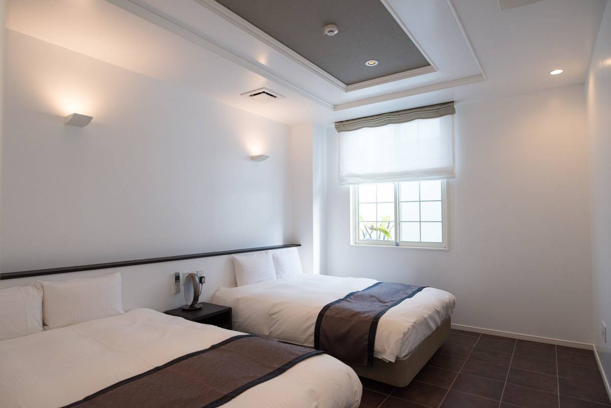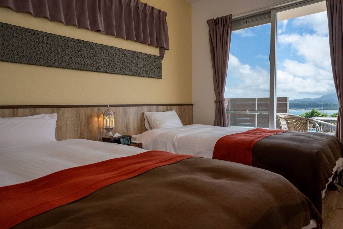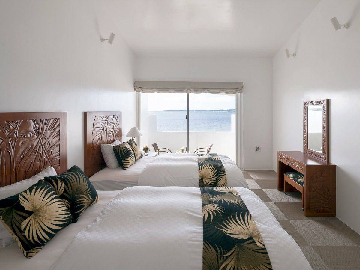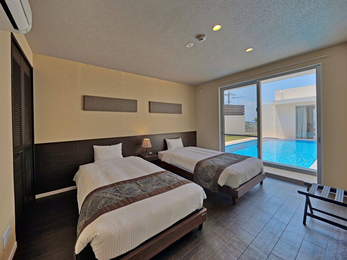 ห้องนอนที่อยู่ชั้นหนึ่งและชั้นสองเป็นห้องเตียงคู่เหมือนกัน เป็นเตียงแบบ Semi Double Bed จะนอนคนเดียวก็ได้ นอนสองคนก็พอดี นอกจากนี้ที่ห้องนั่งเล่นยังมีโซฟาแบบปรับนอน (Sofa Bed) อีกหนึ่งที่ด้วย ถ้ามาพักเป็นกลุ่มใหญ่ล่ะก็ ที่นี่ก็รองรับได้อย่างสบายๆ เลยล่ะ จากห้องนอนชั้นหนึ่งและชั้นสองยังมองเห็นวิวทะเล นอกจากนี้ยังเห็นสะพานโคอุริ (Kouri Bridge) และเกาะอิเอะ (Ie-jima Island) และถ้าขึ้นไปยังดาดฟ้าชั้นสาม ก็จะเห็นเกาะอิเฮยะ (Iheya-jima Island) และเกาะอิเซนะ (Izena-jima Island) อีกด้วย