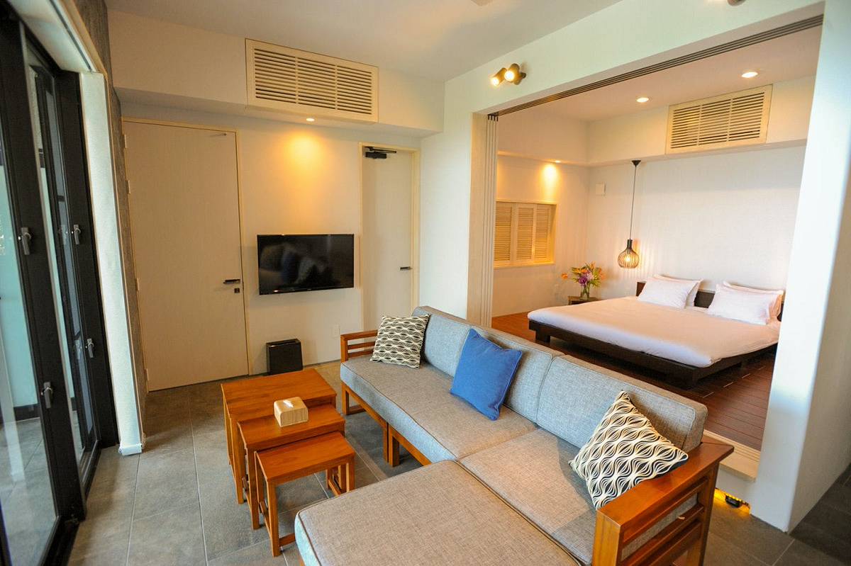 ห้องนั่งเล่นตกแต่งด้วยเฟอร์นิเจอร์ไม้ ประดับด้วยแสงไฟอุ่นๆ เป็นดีไซน์ที่เรียบง่าย แต่ชวนให้ใจสงบ วิวหน้าห้องนั่งเล่นที่เป็นฟ้าสีครามและทะเลของเกาะโคอุริ บวกกับแสงแดดอ่อนๆ และลมเย็นที่พัดเข้ามา ยิ่งทำให้การมาพักผ่อนครั้งนี้พิเศษมากขึ้น ในตอนเย็นจะขึ้นไปชมวิวพระอาทิตย์ตกบนดาดฟ้าก็โรแมนติกไม่น้อย เพราะมี Water Space เป็นบ่อน้ำบนดาดฟ้า ให้ได้ถ่ายรูปท้องฟ้าที่เปลี่ยนสีกลายเป็นสีส้มสะท้อนกับผิวน้ำไว้เก็บสักรูปสองรูปเป็นความทรงจำ
