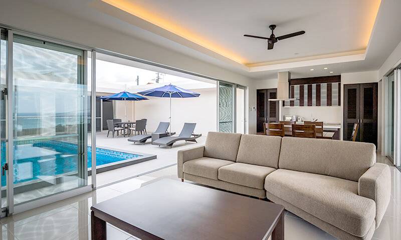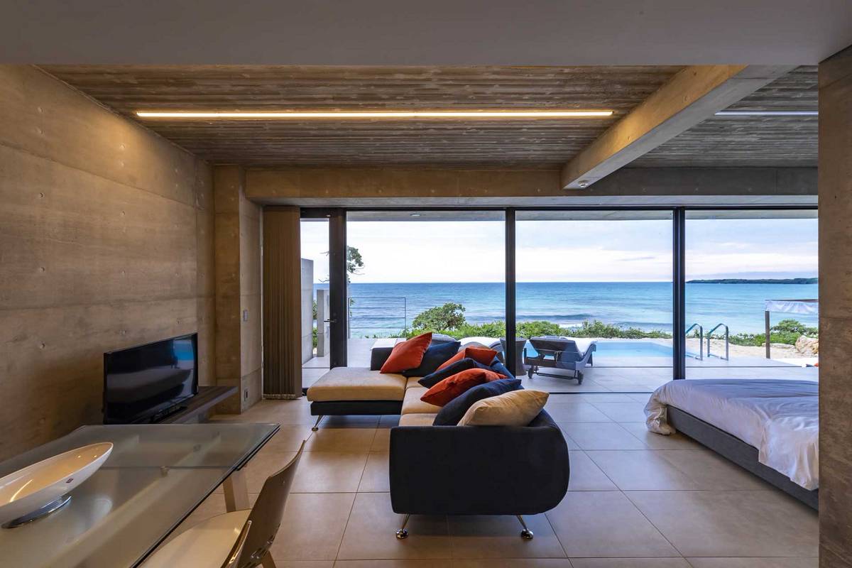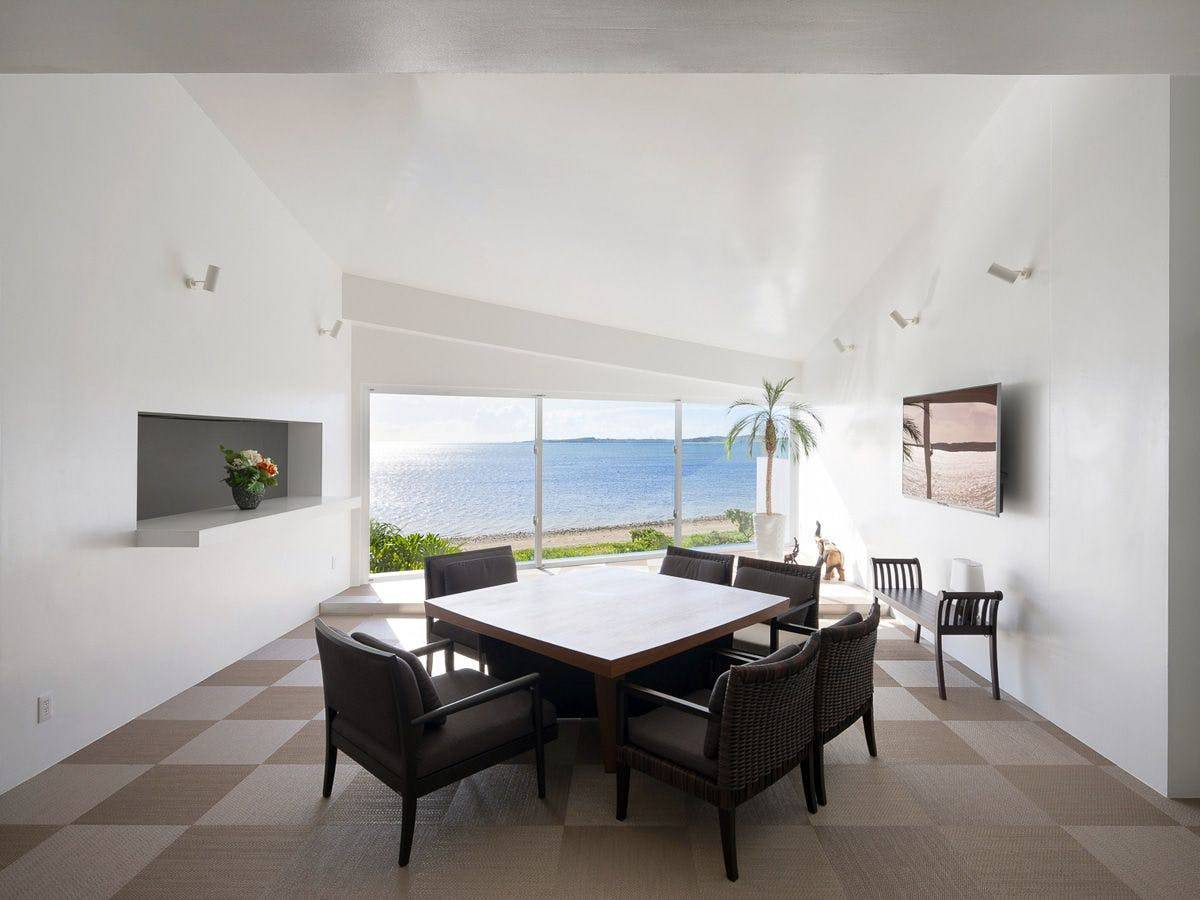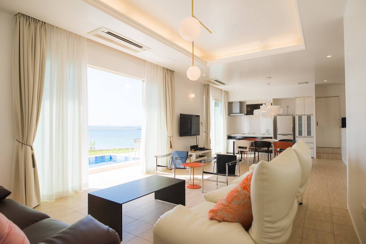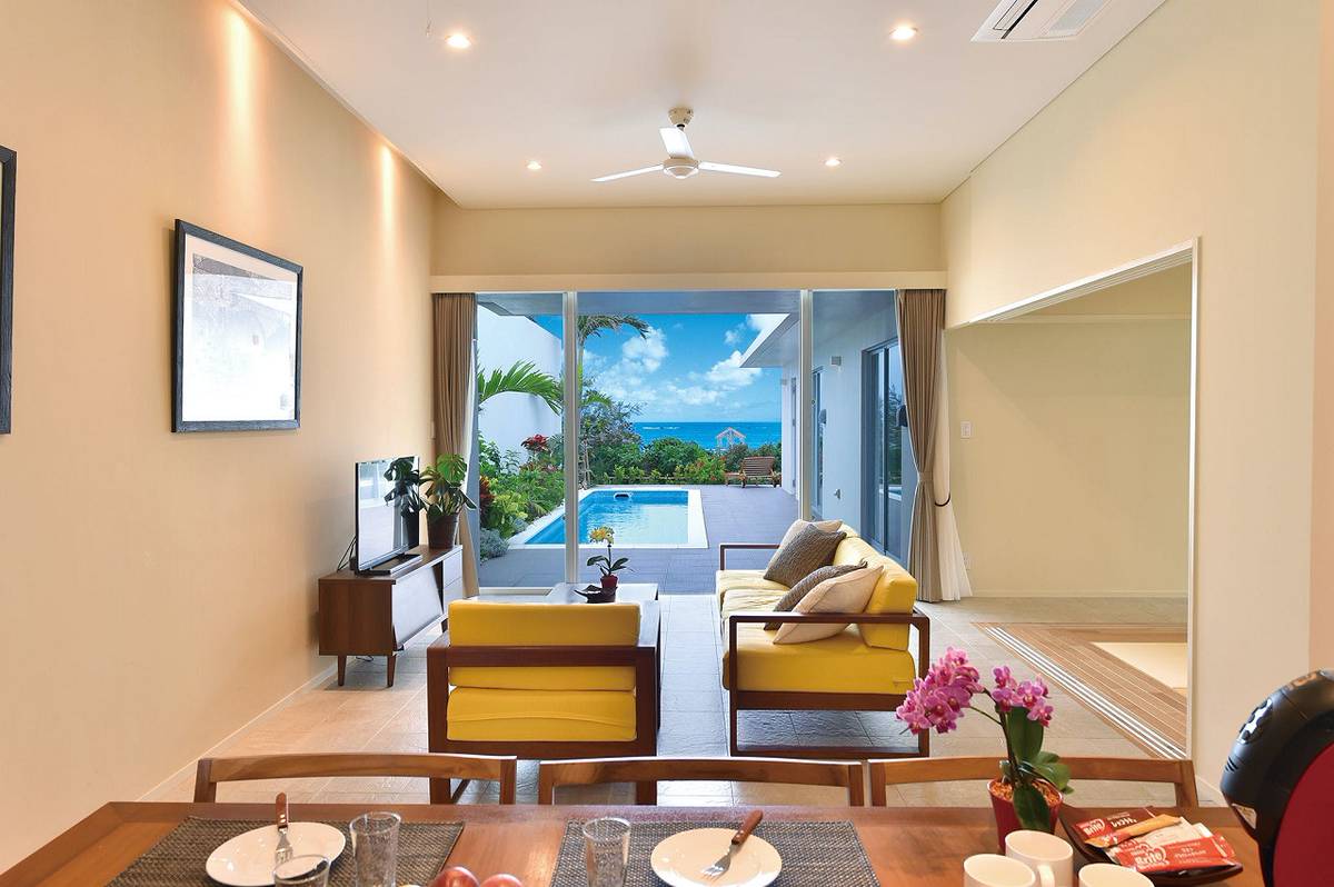 ภายในโซนห้องนั่งเล่น รวมไปถึงโซนโต๊ะกินข้าวนั้นตกแต่งสไตล์บาหลี ได้บรรยากาศของวันหยุดที่ผ่อนคลายและสงบ เพดานที่สูงยิ่งทำให้รู้สึกปลอดโปร่งมากขึ้น จากห้องนั่งเล่นยังมองเห็นทะเลของเกาะมิยาโกะ ท้องฟ้าสีครามและสระว่ายน้ำส่วนตัวผ่านทางกระจกบานใหญ่ได้อีกด้วย โซนครัวก็มีสิ่งอำนวยความสะดวกและอุปกรณ์ต่างๆ ไว้ให้ได้ใช้มากมาย สามารถสนุกกับการทำอาหารระหว่างเข้าพักได้