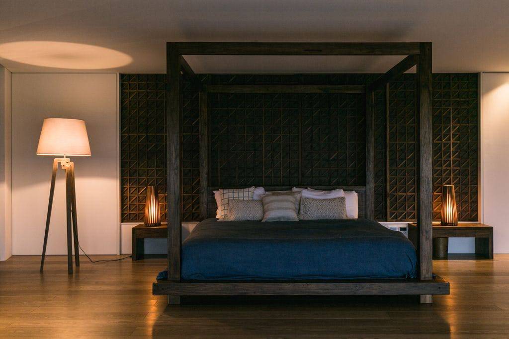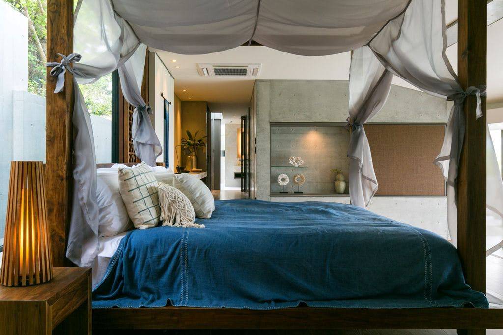 ในส่วนของเตียงนอน ทางวิลล่าจัดเตรียมเตียงแบบคิงไซส์ ขนาด 6 ฟุตไว้ให้ได้นอนพักผ่อน ให้ผู้เข้าพักได้นอนหลับสบายๆ บนเตียงขนาดใหญ่นี้ นอกจากนี้รอบๆ เตียงยังตกแต่งด้วยโครงไม้เพิ่มดีไซน์ให้ดูเก๋ ระหว่างที่นอนชิลล์ๆ บนเตียงก็ยังสามารถเพลิดเพลินกับวิวอันสวยงามของท้องฟ้ากับทะเลที่มาบรรจบกัน ส่วนห้องน้ำนั้นอยู่สุดทางเดิน สามารถใช้เวลาอย่างช้าๆ แช่บ่อจากุชชี่จนหนำใจ