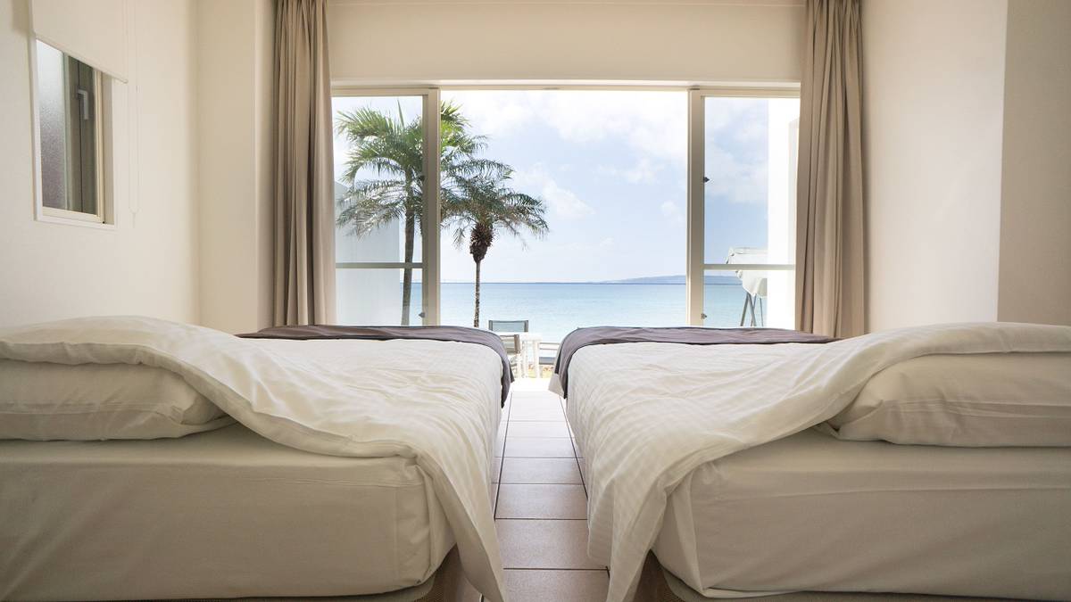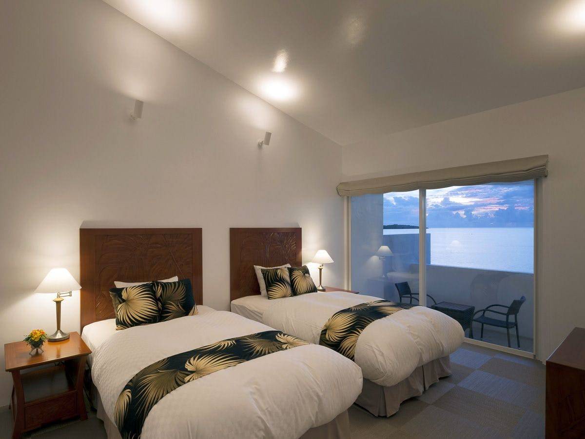 ห้องนอนแบบทวินสีขาว ตกแต่งด้วยเฟอร์นิเจอร์ที่ให้บรรยากาศที่คุ้นเคย ด้วยบรรยากาศที่เงียบเชียบ ระหว่างที่นอนก็จะได้ยินเสียงคลื่นทะเลซัดเป็นระยะๆ และยังมองเห็นดาวผ่านทางหน้าต่างของห้องพักด้วย ส่วนห้องอาบน้ำที่อยู่ถัดไป ทางที่พักมีอ่างอาบน้ำเตรียมไว้ สามารถแช่อ่างไปพลางชมวิวทะเลสวยๆ ตรงหน้าได้อย่างสบายใจ