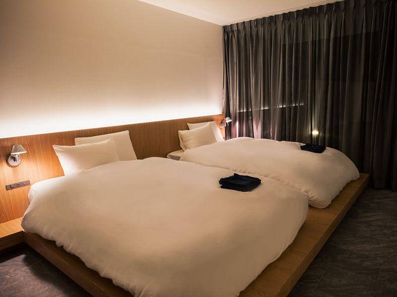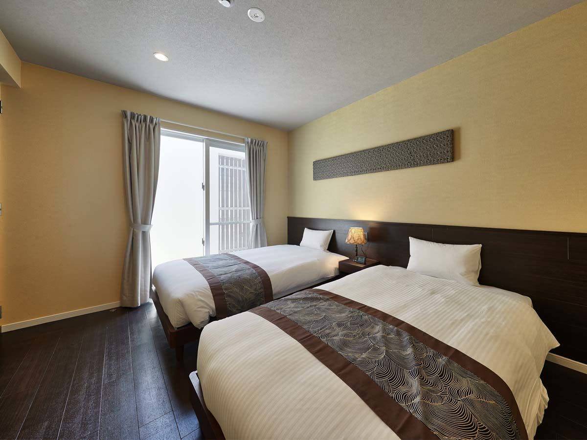 ห้องนอนนั้นจะอยู่ทางซ้ายมือของห้องนั่งเล่น เป็นห้องแบบเตียงคู่ ตกแต่งด้วยเฟอร์นิเจอร์สีน้ำตาลเหมือนกัน ถึงที่พักจะเป็นสไตล์โมเดิร์นแต่ก็แอบเพิ่มความเป็นญี่ปุ่นเข้าไปด้วยการปูเสื่อทาทามิใต้เตียงนอน ภายในห้องนอนมีโทรทัศน์ LED ติดผนัง ก่อนนอนถ้าได้ดูหนังสนุกๆ สักเรื่องก็คงจะเป็นความทรงจำที่ดีไม่น้อย ในห้องนอนจะมีแค่อ่างล้างหน้า ส่วนตัวห้องน้ำจะแยกออกจากตัวห้องนอน อยู่ติดกับอีกฝั่งของห้องนั่งเล่น ภายในห้องน้ำนอกจากจะมีที่อาบน้ำแบบฝักบัวแล้ว ก็ยังมีอ่างอาบน้ำเล็กๆ ให้ได้แช่กันเพลินๆ ด้วย