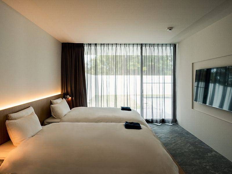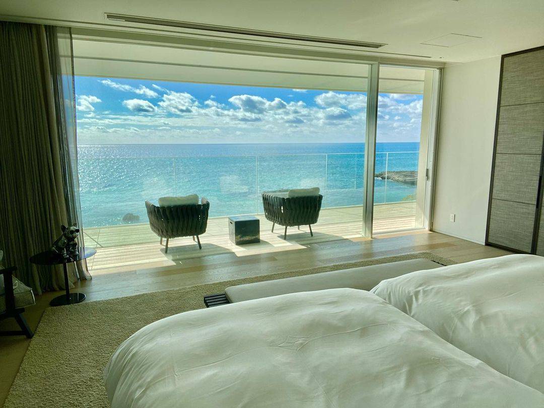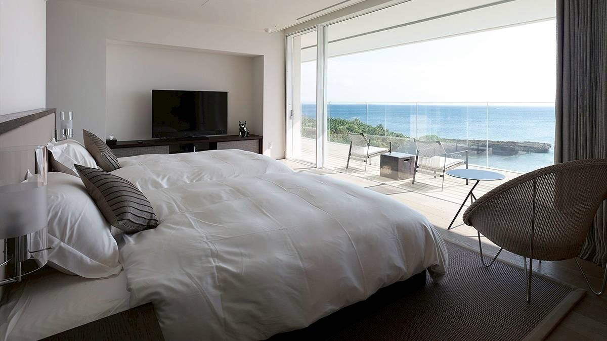 ห้องนอนถูกออกแบบมาอย่างทันสมัย จากมุมนี้ก็มองเห็นวิวที่แสงแดดส่องกระทบกับน้ำทะเลได้เช่นกัน เตียงเป็นแบบ Double Size สามารถนอนเตียงละสองคนได้สบายๆ ห้องนอนเองก็จะเชื่อมกับระเบียงข้างนอกเช่นกัน โซนห้องน้ำมีขนาดใหญ่ ในบางห้องพัก ห้องน้ำจะถูกแยกออกมาจากห้องนอน กระจกบานใหญ่ของห้องน้ำจะเชื่อมกับฝั่งสวน สามารถเปิดกระจกรับลมระหว่างแช่ในอ่างเพลินๆ