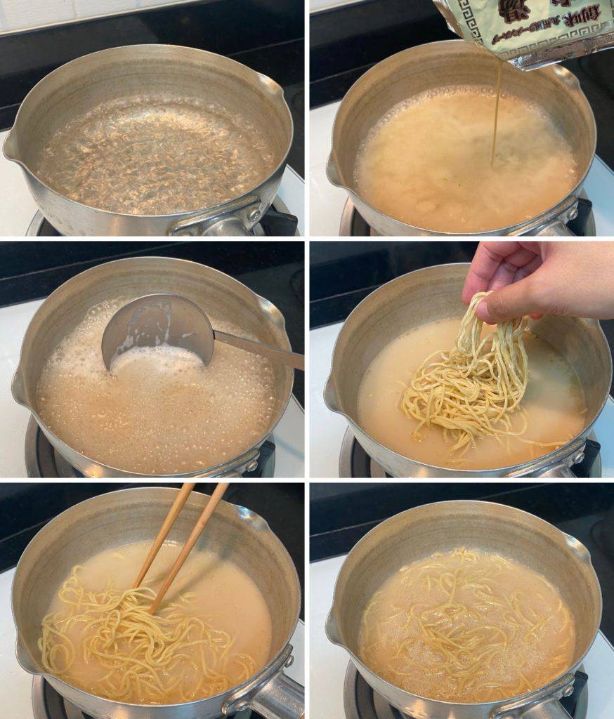 2. ต้มน้ำราเมน ใส่น้ำซุปแล้วรอจนเดือด ใส่เส้นราเมนลงไปลวก