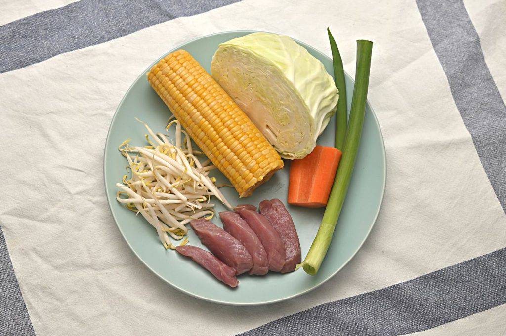 1. หั่นหมู กะหล่ำปลี เป็นชิ้นขนาดพอดีคำ และหั่นแครอทเป็นเส้น