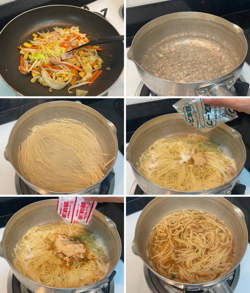 4. แล้วเติมน้ำเปล่าลงในกระทะเดิม ใส่ซุปราเมน แล้วต้มจนเดือด