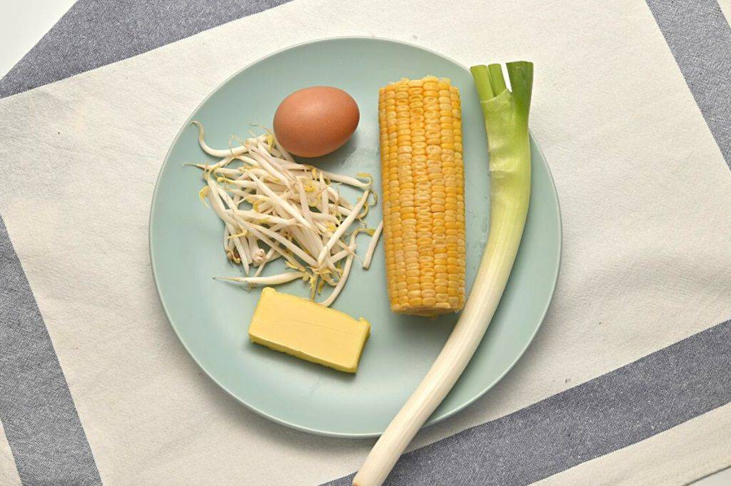 1. หั่นข้าวโพด ต้นหอม เนย ไข่ เตรียมไว้