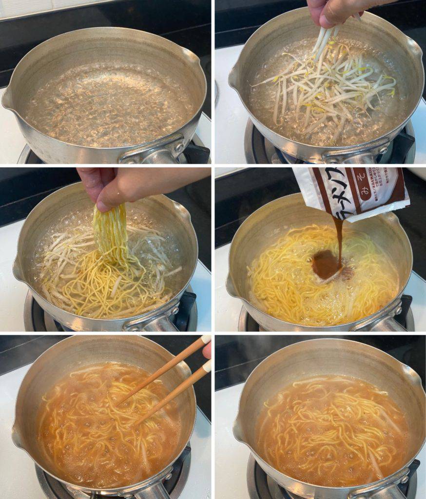 2. ต้มน้ำราเมน ใส่ถั่วงอกลงไปต้มด้วยแล้วรอจนเดือด ใส่เส้นราเมนลงไปลวก