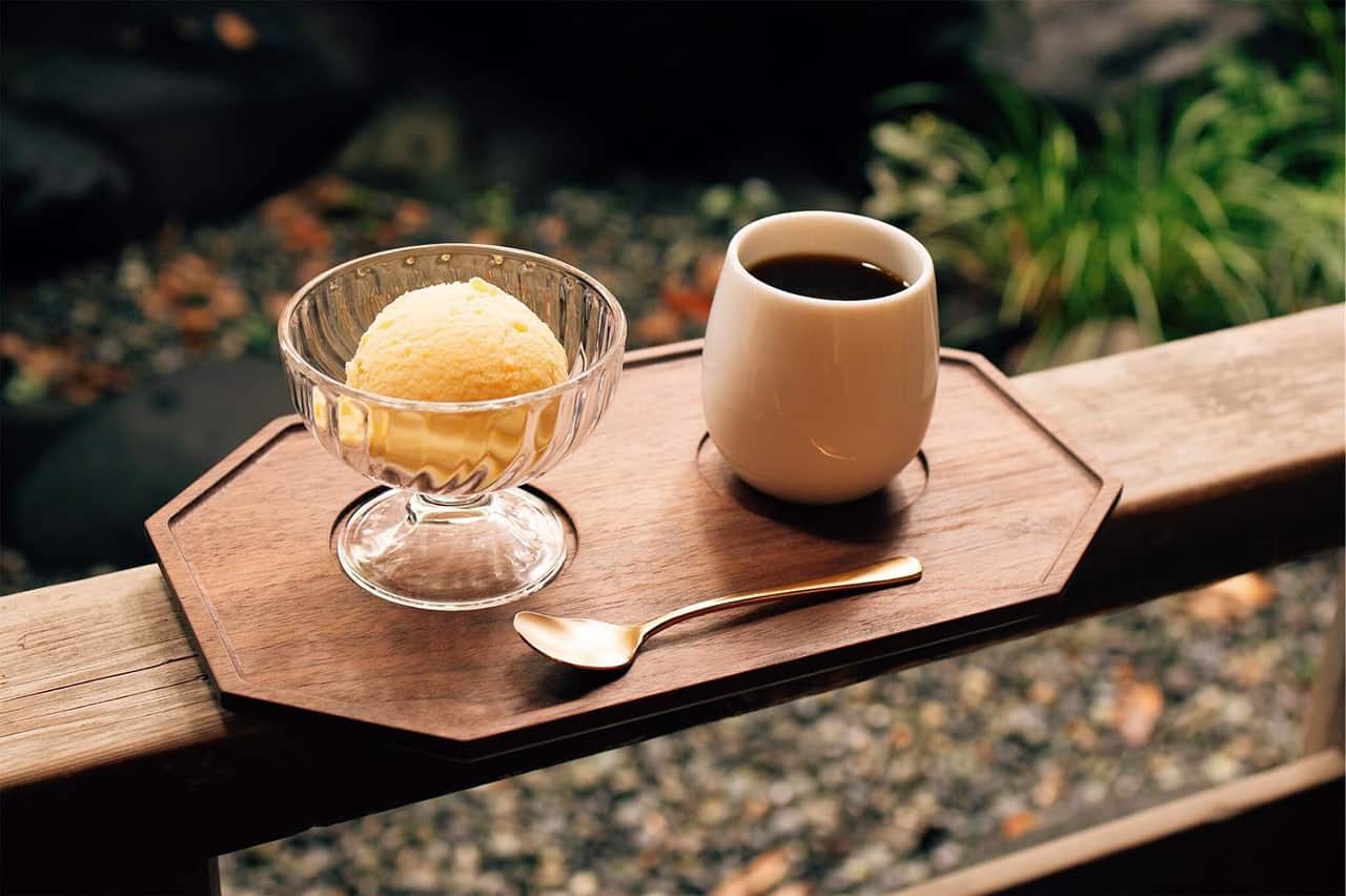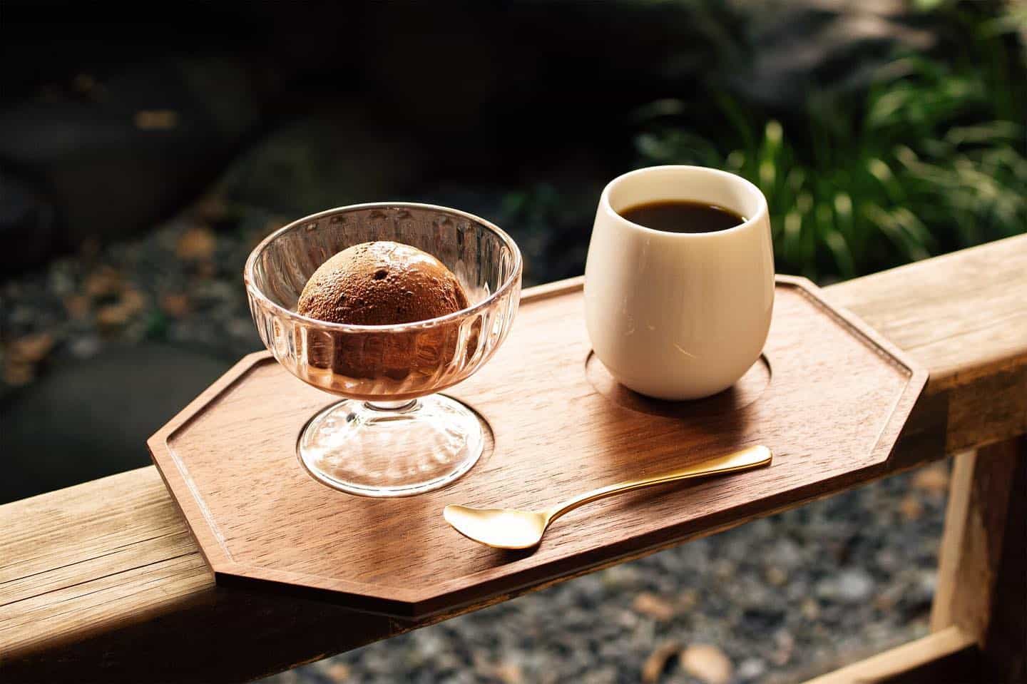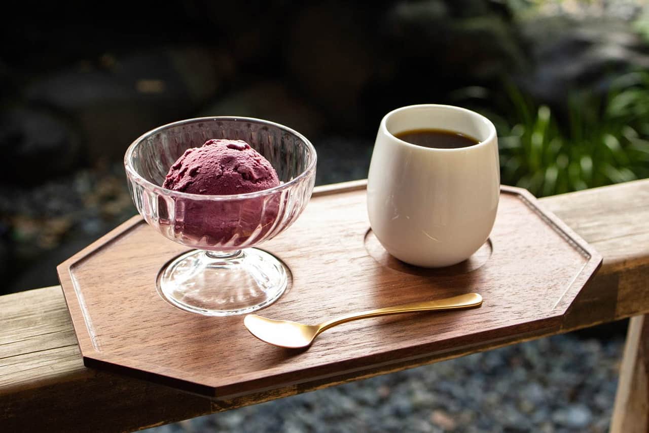 ทางร้านจะเสิร์ฟของหวานแบบเซ็ตมาพร้อมถาดไม้สองหลุมสำหรับใส่เครื่องดื่มและไอศกรีม ซึ่งเมนูที่ทางร้านจับคู่แนะนำเราคือ ไอศกรีมที่ทำจากผลบลูเบอร์รี่ของฟาร์มอากิซาวะ (Akizawa Farm) เมืองโอดาวาระ จังหวัดคานางาวะ และพิงค์เบอร์เบิน (Pink Bourbon) กาแฟสายพันธุ์เบอร์เบินที่มีเมล็ดสุกเป็นสีชมพูจากโคลอมเบีย ให้รสชาติหวานนิดๆ ซึ่งเกิดขึ้นในระหว่างกระบวนการหมักของเมล็ดกาแฟ เป็นเมนูที่ทำให้เราสามารถเพลิดเพลินกับรสชาติของเบอร์รี่ได้ทั้งจากไอศกรีมหวานฉ่ำและกาแฟรสเข้มข้นได้ในเวลาเดียวกัน