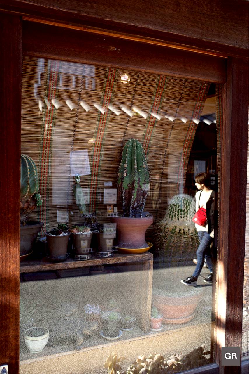 ส่วนภาพนี้เกิดขึ้นมาระหว่างที่เดินเล่นชมเมืองในคุราชิกิ (Kurashiki) แล้วมาเจอ Window Display ของร้านค้าหนึ่งมีต้นกระบองเพชรต้นใหญ่ที่น่าสนใจวางโชว์อยู่ ซึ่งในขณะนั้นก็มีคนสะพายกระเป๋าสีแดงสดใสเดินสวนทางมาพอดี ทำให้เหมือนเข้ามาเพื่อเติมเรื่องราวให้กับภาพที่เรากำลังมองอยู่ก็เลยรีบยกกล้องขึ้น Snap และถ่ายรูปไว้ได้ทันเพราะมีกล้อง Ricoh GR ในมือตลอดเวลา ซึ่งการกลับมาดูรูปนี้ก็ทำให้นึกถึงตอนที่ถ่ายรูปนี้ได้ ความรู้สึกสนุกก็ตามกลับมาอีกครั้ง เพราะหากช้าไปนิดเดียวก็คงพลาดไปอย่างน่าเสียดาย !