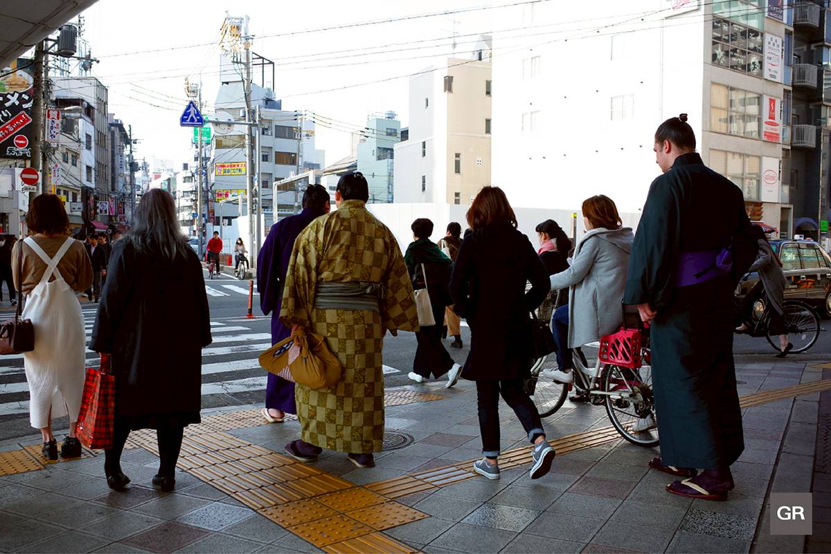 กล้อง Ricoh GR เป็นกล้องที่ทำให้เราถ่ายรูปได้ในทุกๆ สถานที่ ไม่ว่าจะเป็นแหล่งท่องเที่ยวนอกเมืองที่มีธรรมชาติสวยงาม หรือในเวลาที่เข้าเมืองอย่างนี้ ระหว่างที่ยืนรอสัญญาณไฟ เราเจอนักซูโม่ที่รอข้ามถนนพร้อมกับเรา ซึ่งไม่ค่อยได้เห็น และเป็นมุมภาพที่รู้สึกน่าสนใจก็เลยยกกล้องขึ้น Snap ไว้
