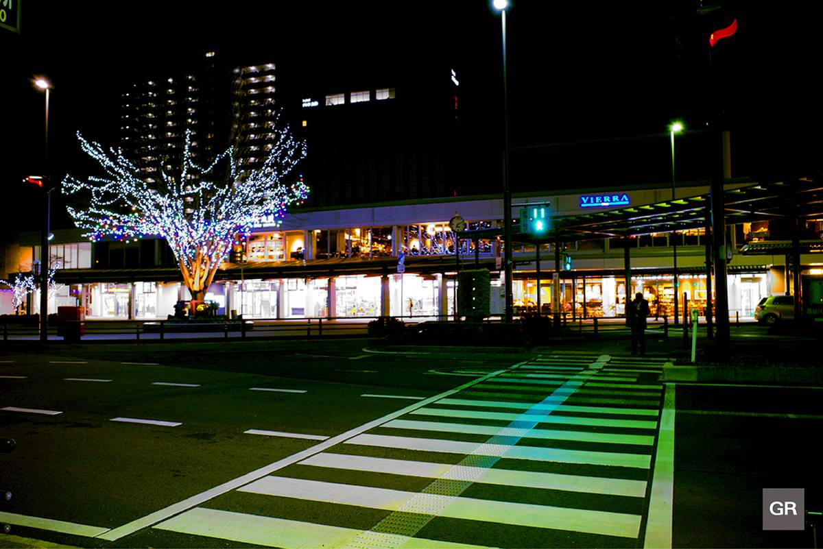 ระหว่างที่กำลังจะข้ามถนนตรงหน้าสถานีรถไฟในเมืองโอตสึ (Otsu) แม้ว่าจะยังไม่ดึกมาก แต่ก็แทบไม่เจอผู้คนบนท้องถนน แสงสว่างของร้านค้า และไฟประดับที่ต้นไม้ที่ช่วยให้บรรยากาศดูไม่เงียบเหงาจนเกินไปสำหรับคืนที่อยู่ในช่วงเทศกาลปีใหม่ แตกต่างจากเมืองใหญ่ๆ ที่ในเวลาเดียวกันแบบนี้คงคึกคักไปด้วยผู้คนมากมาย แต่ว่าการยืนอยู่ในเมืองโอตสึตอนนี้ก็รู็สึกดีมีความสุขในอีกแบบหนึ่งจนอยากบันทึกภาพนี้ไว้ แม้จะไม่มีขาตั้งกล้อง แต่กล้องตัวเล็กๆ นี้ก็ยังถ่ายรูปนี้มาให้เราตามที่ต้องการ !