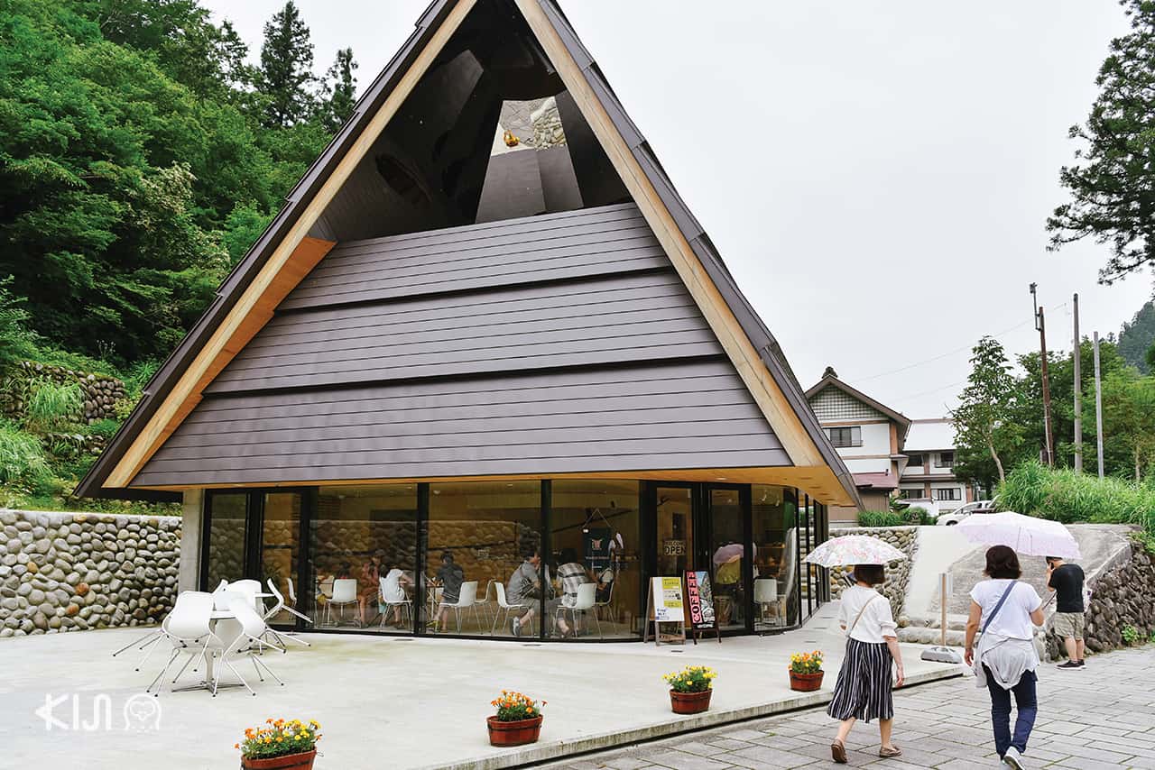 ก่อนกลับอยากให้แวะคาเฟ่และร้านขายของที่ระลึกด้านหน้าทางเข้าสักพัก นั่งจิบกาแฟในอาคารเล็กๆ บรรยากาศไม้สีอ่อนที่ออกแบบโดยสถาปนิกเอง หรือจะขึ้นไปแช่ออนเซ็นเท้า (ฟรี) ที่ชั้น 2 เพื่อผ่อนคลายความเมื่อยล้าจากการเดิน และจะผ่อนคลายสายตาด้วยงานดีไซน์ขณะแช่เท้าก็ได้เช่น