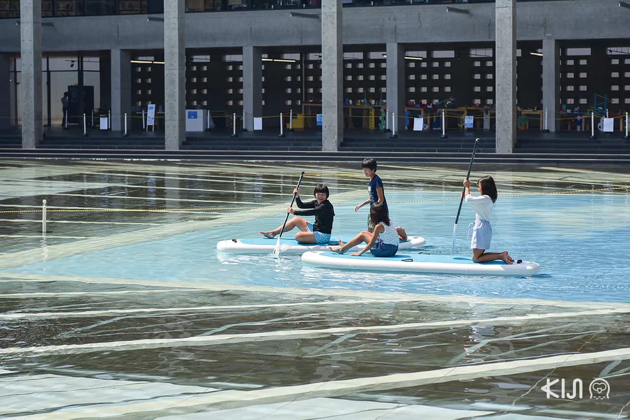 อาคารคอนกรีตทรงสี่เหลี่ยมผืนผ้าสีเทา ผ่านประตูทางเข้ามาจะสะดุดตากับพื้นที่ที่ตรงกลางเปิดโล่งให้เห็นบรรยากาศของท้องฟ้าและมีสระน้ำขนาดใหญ่อยู่ บริเวณรอบๆ สระจะมีอีเว้นท์และกิจกรรมต่างๆ ตลอดทั้งปี