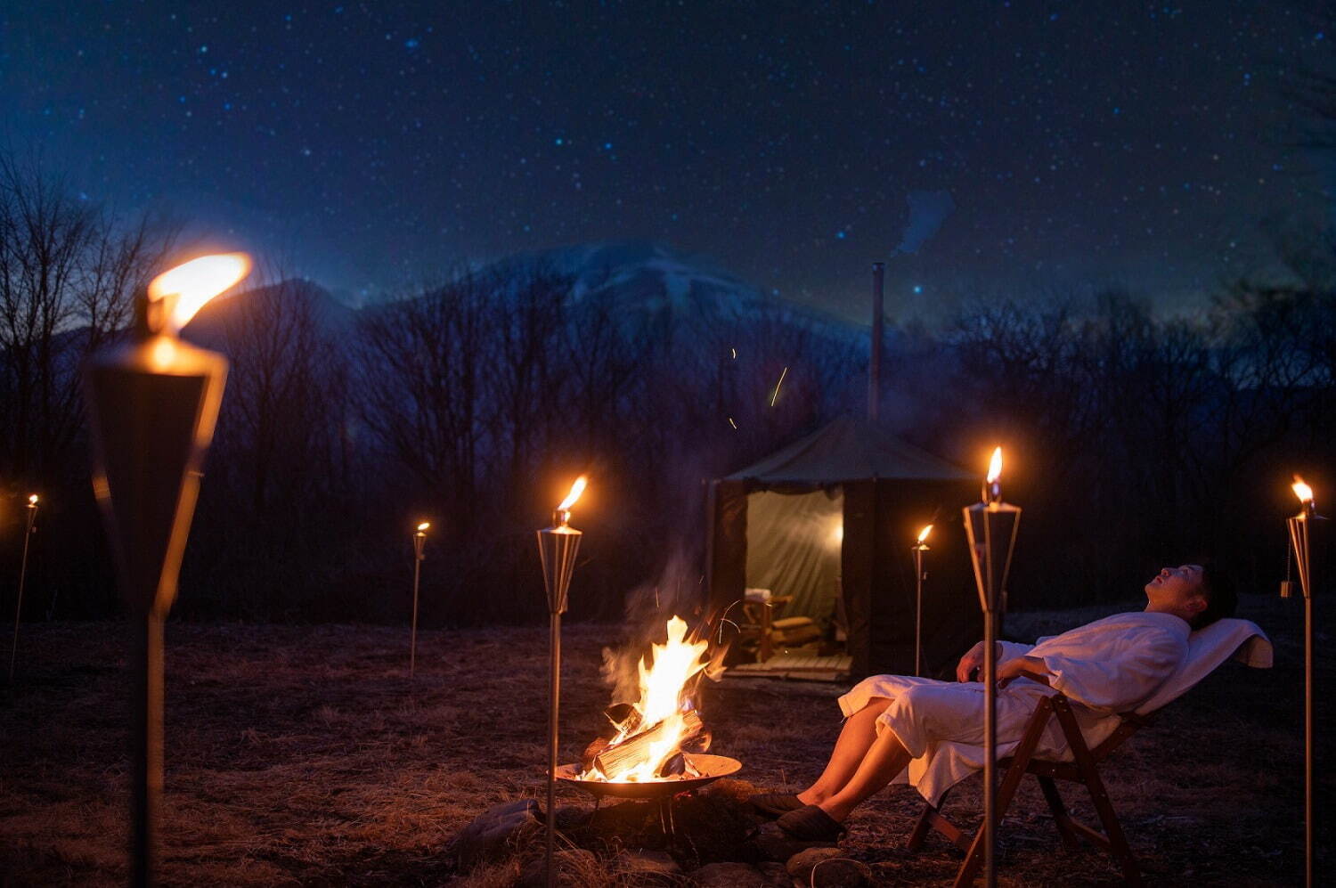 หลังอบซาวน่าเสร็จ เราจะได้สัมผัสกับอากาศเย็นๆ ท่ามกลางธรรมชาติพร้อมได้ชมภาพทิวทัศน์อันงดงามของภูเขาอาซามะ (Mt. Asama) ที่อยู่ตรงหน้า ซึ่งเวลาในขณะนั้นจะเป็นช่วงรุ่งสางพอดี ทั่วท้องฟ้าจะเต็มไปด้วยดวงดาวระยิบระยับก่อนจะค่อยๆ สว่างขึ้น อย่างไรก็ตาม อุณหภูมิด้านนอกจะต่ำประมาณ -10 องศาเซลเซียส ซึ่งถ้าหากร่างกายได้สัมผัสกับอากาศอุ่นและเย็นสลับกันแบบนี้ระบบประสาทจะถูกกระตุ้น ทำให้ร่างกายจะรู้สึกเบาลงและสดชื่นขึ้น