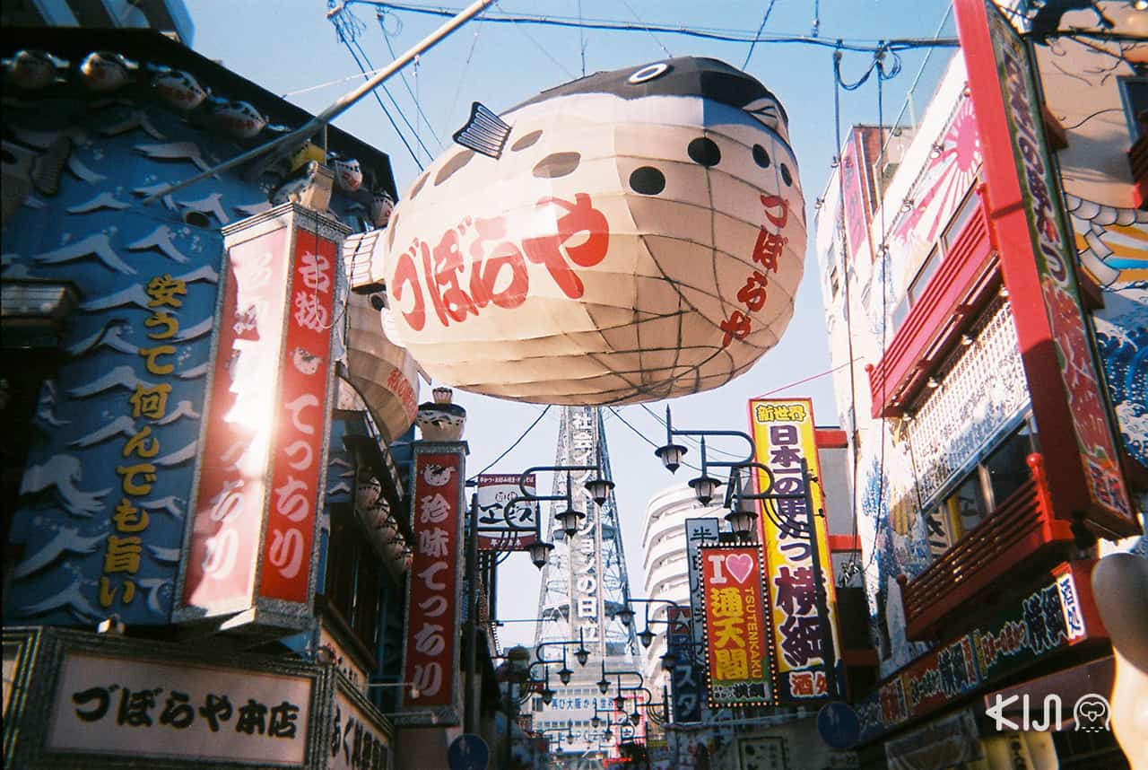 ท้องอิ่มอย่าลืมเดินมาถ่ายรูปกับจุดถ่ายรูปยอดฮิตตรงสี่แยกที่เห็นปลาปักเป้าตัวยักษ์กับหอคอยซึเทนคาคุเป็นภาพพื้นหลังด้วยล่ะ