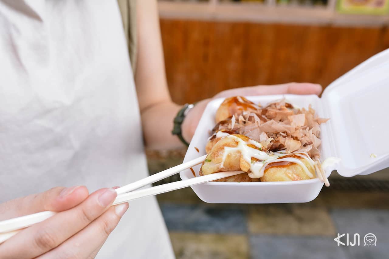 ก่อนมาโอซาก้าเพื่อนชาวญี่ปุ่นบอกกับเราว่าให้ไปกินทาโกยากิที่ย่านชินเซไก เลือกเอาสักร้านรับรองว่าเด็ด พ้นจากตรอกจันจันโยโกโจเดินตามทางมาเรื่อยๆ จะพบกับถนนแห่งร้านอาหาร เราสุ่มเลือกร้านทาโกยากิที่มีรูปนักร้องแปะอยู่ทั่วบอร์ด ซึ่งน่าจะหมายความว่าเป็นที่นิยมพอสมควร ทาโกยากิสอดไส้หมึกชิ้นใหญ่เมื่อผสานกับบรรยากาศรอบๆ ในย่านนั้น ทาโกยากิธรรมดาก็อร่อยขึ้นคูณสิบ