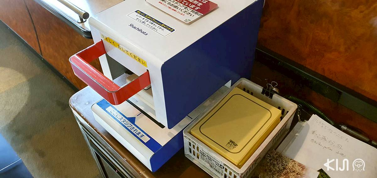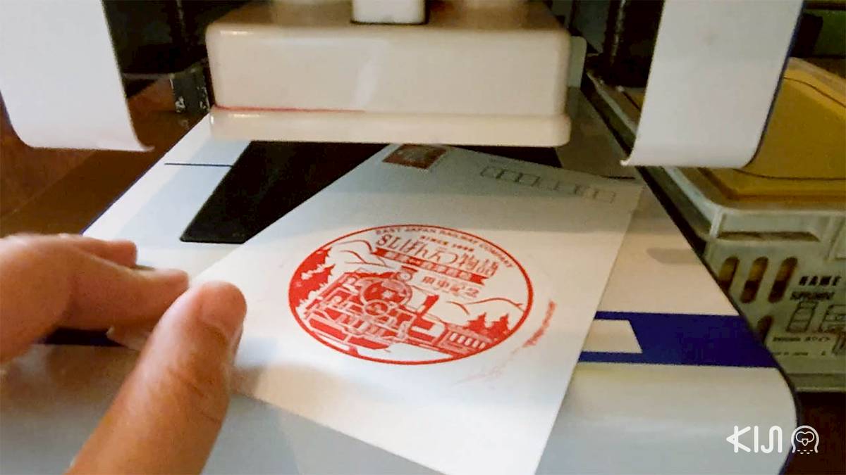 ส่งโปสการ์ดหรือจดหมายเสร็จแล้ว อย่าลืมเดินไปปั๊มตราประทับที่ระลึกซึ่งอยู่ใกล้ๆ กันด้วยนะ ตัวปั๊มอันใหญ่ มีด้ามจับให้กดลง ใช้ง่ายมาก ใครที่ปกติปั๊มแล้วสีไม่ค่อยสม่ำเสมอ มาลองเครื่องนี้ดู