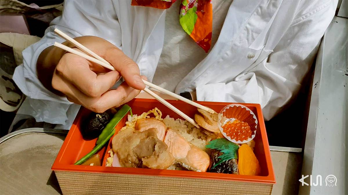 การชิมอาหาร Limited Edition เป็นสิ่งที่พลาดไม่ได้อยู่แล้ว! เบนโตะถูกห่อด้วยรูปรถไฟสวยๆ ชวนชิม ด้านในเป็นของโปรดชาวไทยหลายคนอย่างแซลมอนย่าง หอยเชลล์ ปลาซาบะย่าง ไก่ย่างปรุงรส และไข่ปลาแซลมอน เมื่อได้นั่งกินข้าวพลางมองวิวสวยๆ นอกหน้าต่าง อาหารก็ยิ่งอร่อยกว่าเดิม