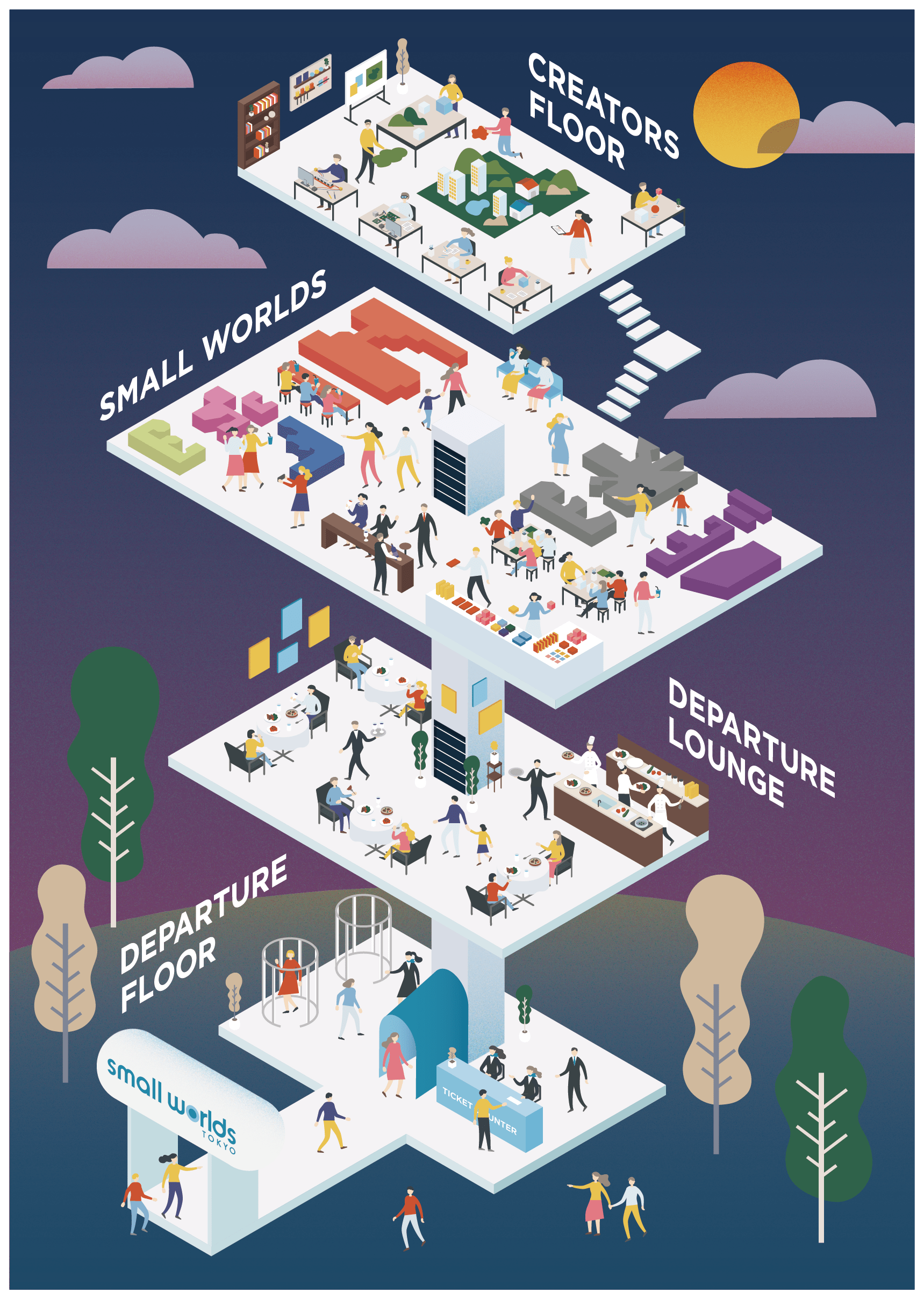 Small World Tokyo แบ่งออกเป็น 4 ชั้น ได้แก่ ชั้น 1 Departure Floor พื้นจำหน่ายตั๋วเข้าชม, ชั้น 2 Departure Lounge รวบรวมร้านอาหารหลากชนชาติ, ชั้น 3 Small World พื้นที่หลักจัดแสดงของจิ๋ว และชั้น 4 Creator’s Floor จัดแสดงกระบวนการก่อนจะมาเป็นของจิ๋วแต่ละชิ้น รวมถึงเปิดโอกาสให้สามารถลองทำของจิ๋วได้ด้วย