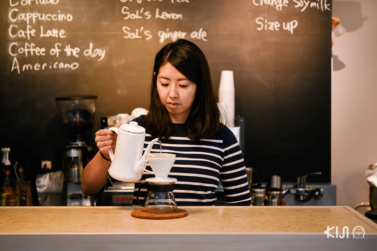 ดูเหมือนว่าปัจจุบันกาแฟจะเป็นอีกหนึ่งส่วนสำคัญในการดำเนินชีวิตของใครหลายคน เราขอชวนคุณไปชิมกาแฟที่หอมกรุ่นรสชาติดีที่ SOL’S COFFEE ร้านกาแฟเล็กๆ เปิดตัวเมื่อปี ค.ศ. 2013 ที่ดูเหมือนเหมาะกับการซื้อกลับแบบ Take Out มากกว่านั่งกินที่ร้าน แต่เบื้องหลังเต็มไปด้วยความพิถีพิถันในกาแฟทุกเมล็ดจนมีมากถึง 3 สาขาในย่านคุรามาเอะ แต่สาขาที่เราแนะนำคือ SOL’S COFFEE ROASTERY ที่มีเครื่องคั่วขนาด 10 กิโลกรัมตั้งอยู่ภายในร้าน และมีเมล็ดกาแฟคั่วพิเศษให้เลือกซื้อกลับบ้านมากถึง 8 ชนิด ที่ผ่านการคัดเลือกเมล็ดด้วยมือถึง 2 ครั้ง และทางร้านจะเลือกใช้เมล็ดสดที่เก็บมาไม่เกิน 1 ปีเท่านั้น