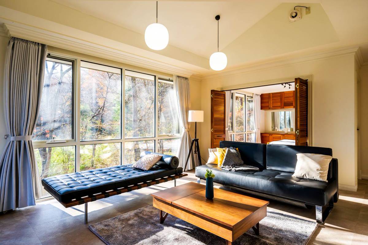 ด้านในตกแต่งด้วยเฟอร์นิเจอร์หนังสีดำตัดกับโต๊ะและบานพับสีน้ำตาล ส่วนผนังบ้านเป็นสีขาวสไตล์มินิมอล นอกจากนี้ผู้ออกแบบต้องการให้แขกที่มาเข้าพักรู้สึกปลอดโปร่งเมื่อเดินเข้ามา จึงได้ออกแบบให้เพดานยกสูงเพื่อเพิ่มพื้นที่ เมื่อมองออกไปด้านนอกหน้าต่างจะพบกับวิวป่าไม้ที่เปลี่ยนสีสันไปตามแต่ละฤดูกาล