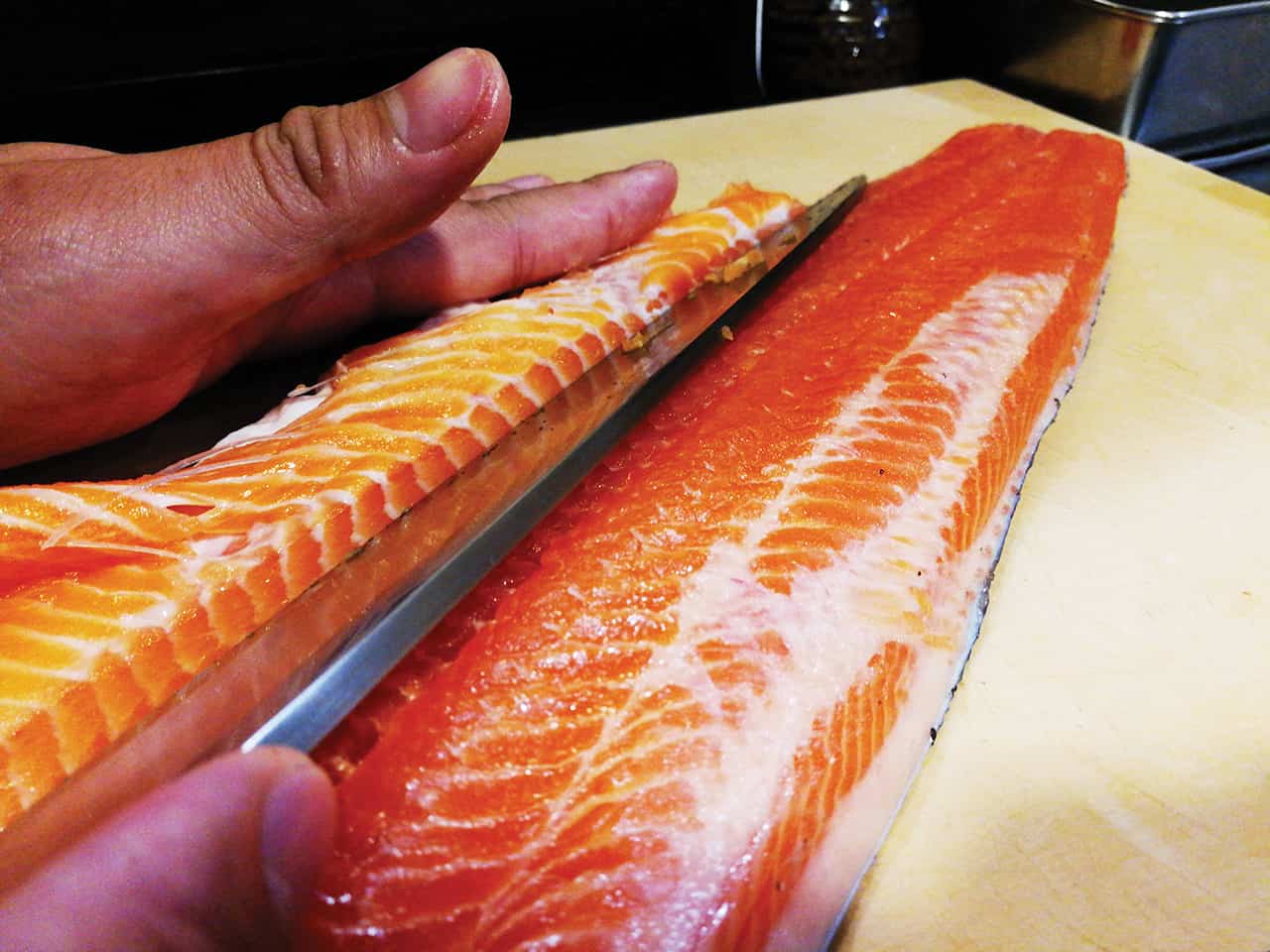 ตระกูลหลักๆ ของแซลมอนนี่ส่วนตัวผมมีโอกาสผ่านมือมาหมดแล้ว อย่างคิงแซลมอนหรือชินุไปจนถึงแซลมอนเนื้อขาว (แซลมอนธรรมชาติที่ปัจจุบันหาได้ยากแล้ว) ซึ่งคิงแซลมอนเขาจะเด่นเรื่องของรสชาติ ความหอม ไขมัน ทั้งมีขนาดที่ใหญ่ (20-30 กิโลกรัม) ดังนั้นเลยนิยมเลี้ยงกันในเชิงอุตสาหกรรม ปกติแซลมอนจะแบ่งเป็น 2 ฝั่งคือแปซิฟิกและแอตแลนติก แอตแลนติกพันธุ์ดีๆ จะมาจากสก็อตแลนด์ที่เขาเรียกว่าสก็อตทิชแซลมอน อันนี้คุณภาพดีทั้งเนื้อสัมผัสและรสชาติ รองลงมาก็แทสมาเนียนแซลมอนของทางออสเตรเลียที่ลำตัวของแซลมอนจะผอมกว่าสก็อตทิช ส่วนเนื้อก็จะสีเข้มกว่าทั้งไขมันน้อยและมีกลิ่นหอม ส่วนนอร์เวย์ก็ตามมาตรฐานตลาดเนื้อสวยไขมันเยอะ อันดับสุดท้ายก็คือชิลีที่เขามักจะเอาไปแช่แข็งกัน ส่วนในแถบแปซิฟิกก็จะมีคิงแซลมอนหรือชินุที่แยกย่อยออกมาเป็นเรดคิง มาเบิ้ลคิง และไอวอรี่คิง ถัดมาก็จะเป็นซ็อกอายที่ก็มีเรดแซลมอนและแลนด์ล็อกแซลมอน (ฮิเมมัตสึ) แบ่งออกไปอีก ส่วนชัมแซลมอนที่ชาวญี่ปุ่นเรียกว่าชิโรซาเกะนั้นก็จะเป็นพันธุ์ญี่ปุ่นที่อยู่ในแถบฮอกไกโด อันนี้เนื้อจะลีน หอม น้อยมากที่จะมีไขมัน และโคโฮ (จินซาเกะ) ที่ขึ้นขื่อว่าไข่คุณภาพดี ส่วนพิงก์เนี่ยหากินสดไม่ค่อยได้เพราะมีแต่เกรดแช่แข็งที่เห็นบ่อยๆ ตามร้านอาหารเพื่อสุขภาพ ส่วนใหญ่เขานิยมเอามาทำเป็นปลากระป๋องเพราะสีอ่อนจนดูไม่เหมือนปลาแซลมอน